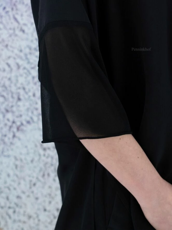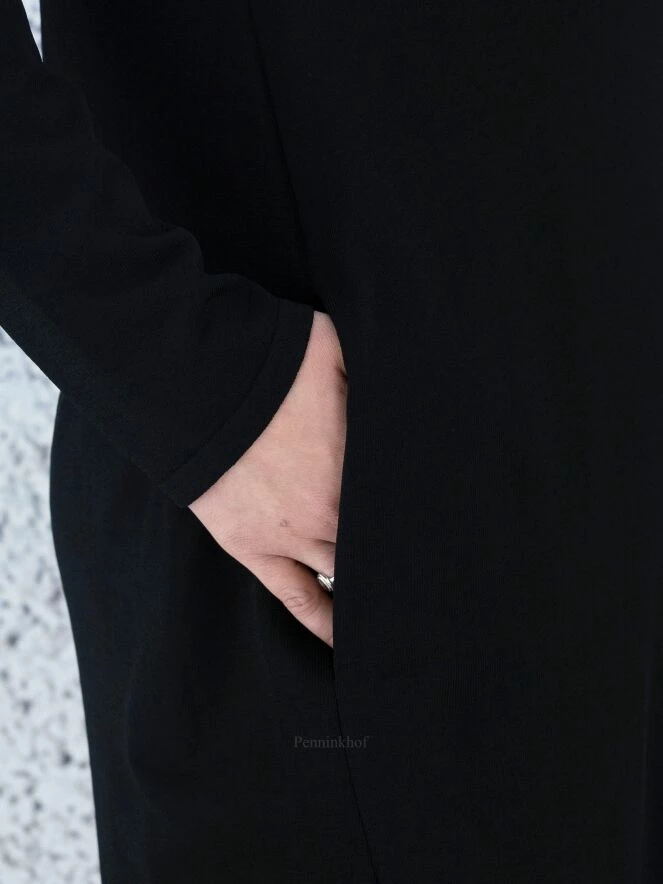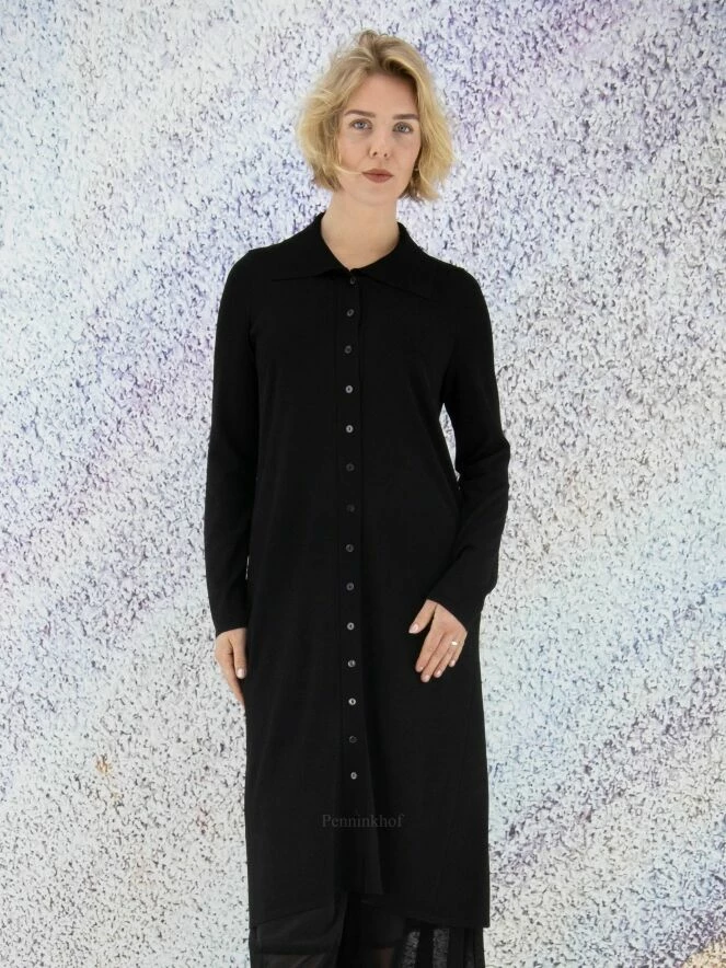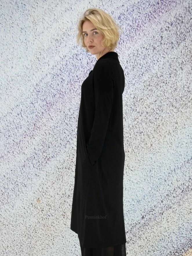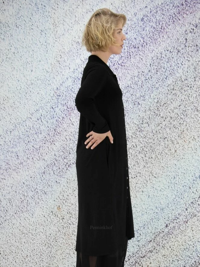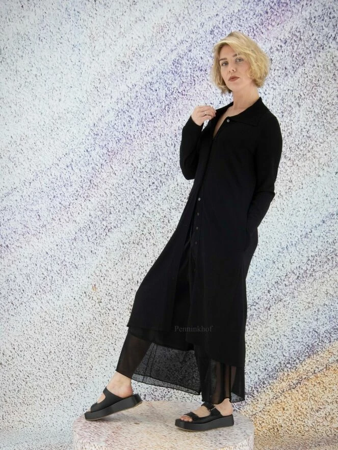 Luxueux gilet long de la marque Annette Görtz, de couleur noire. Il est doté de poches fendues au niveau de la taille. Le gilet présente une longue patte de boutonnage et des manches longues. Lavage à la main.
