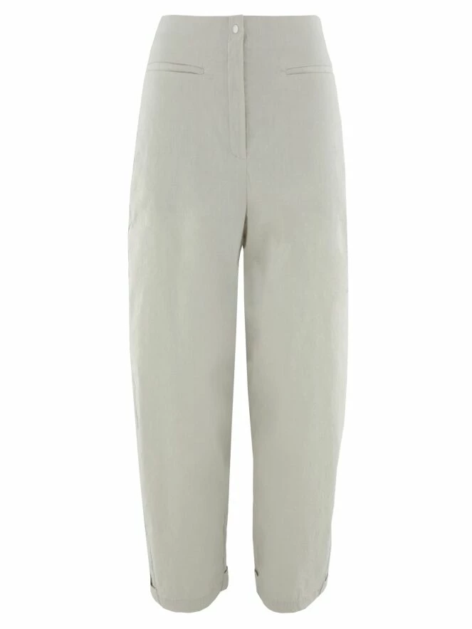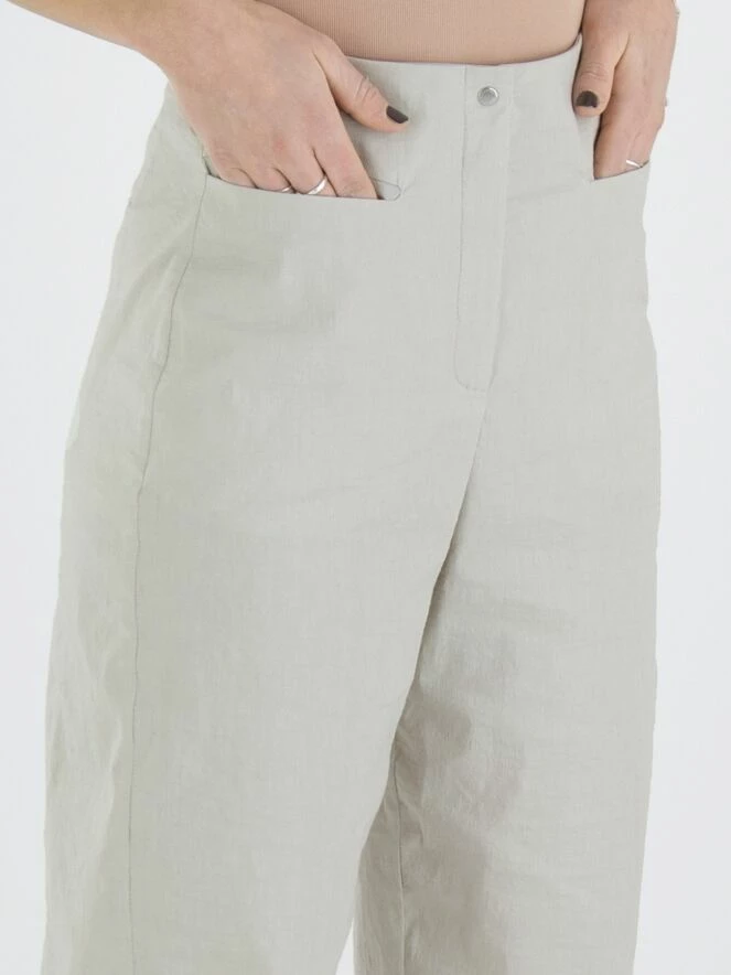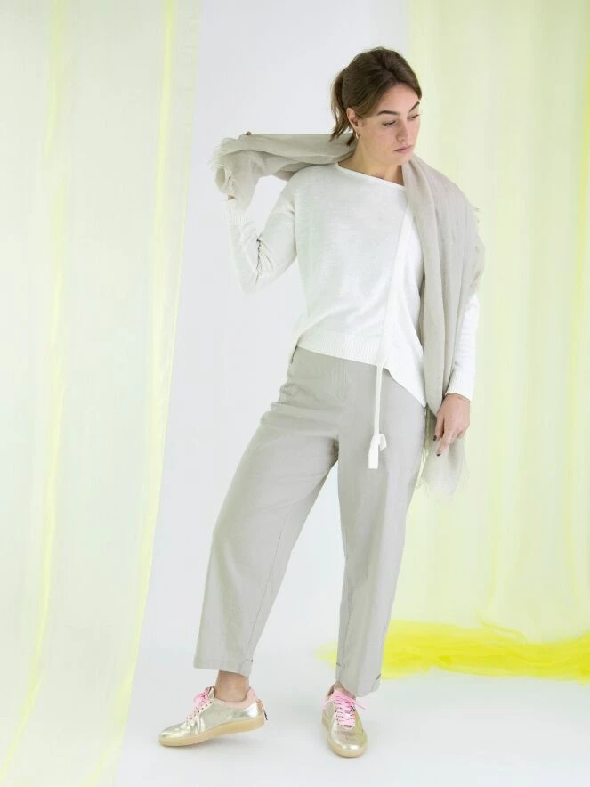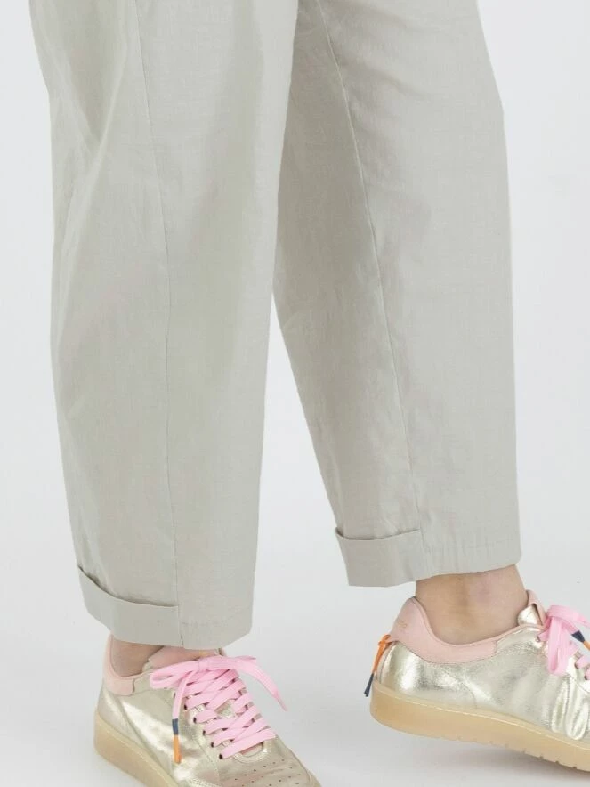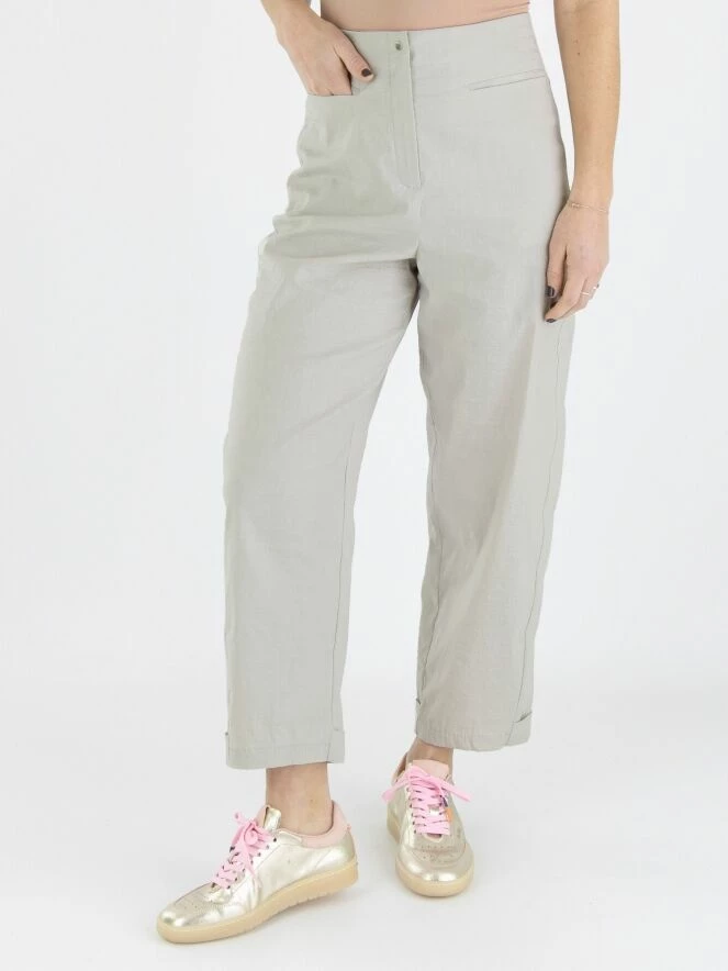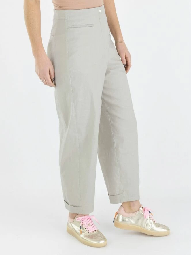 Pantalon d’Annette Görtz en gris clair. Le tissu a une structure froncée. Au bas des jambes, il y a un petit revers à l’arrière. Le pantalon a des poches droites et peut être lavé à 30 degrés.