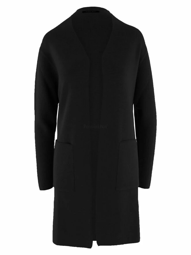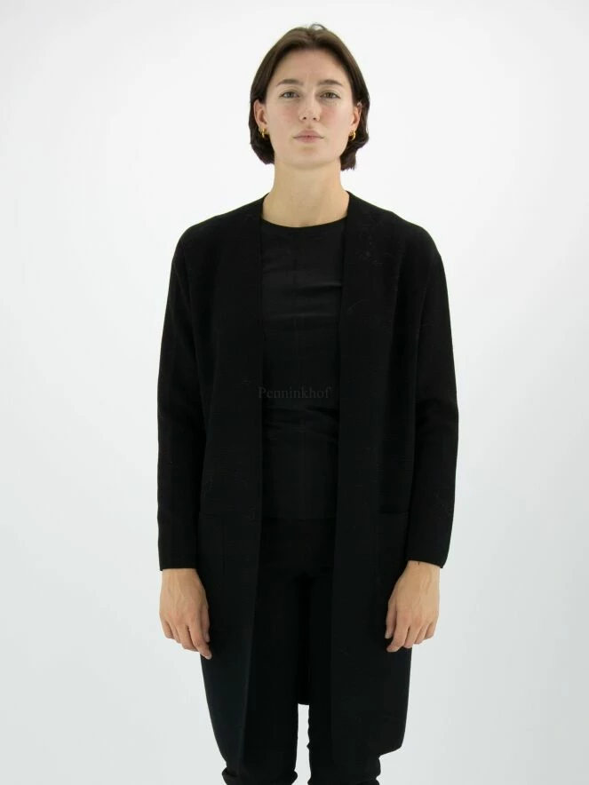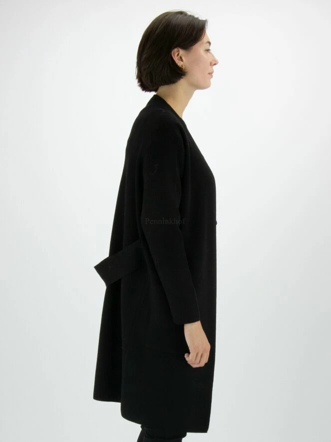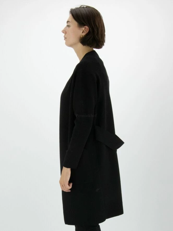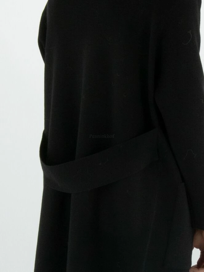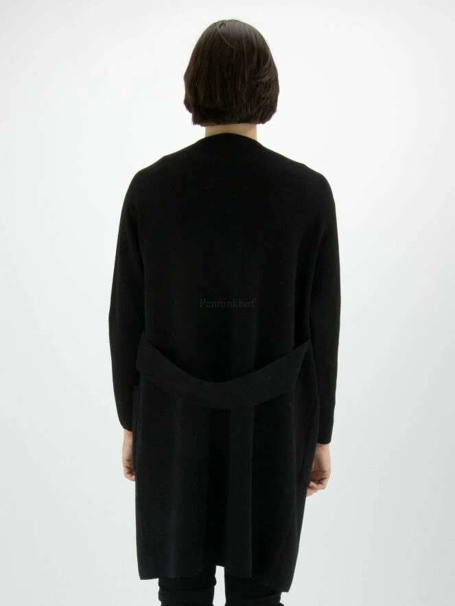 Un cardigan luxueux d’Annette Görtz en noir. Une ceinture du même tissu que le cardigan est fixée à la taille. Le cardigan n’a pas de fermeture et peut être lavé à la main.
