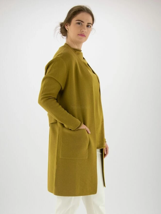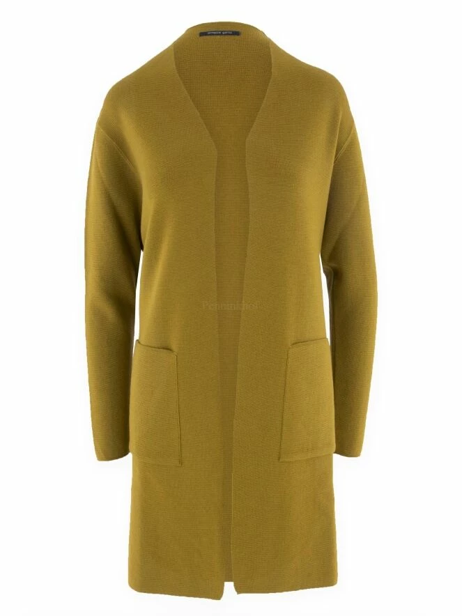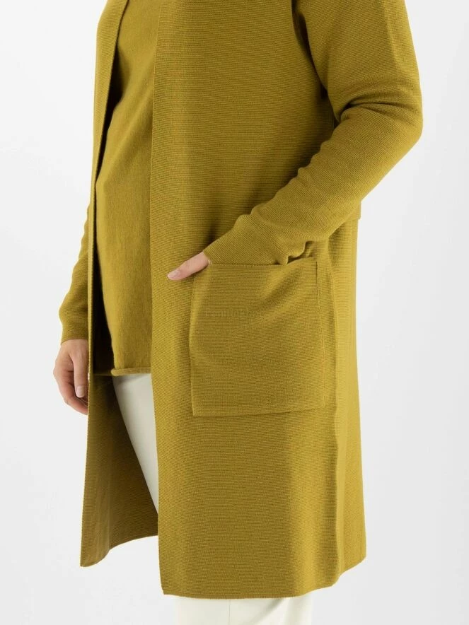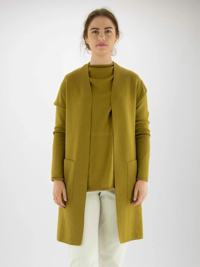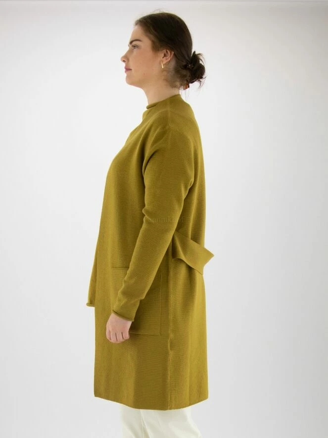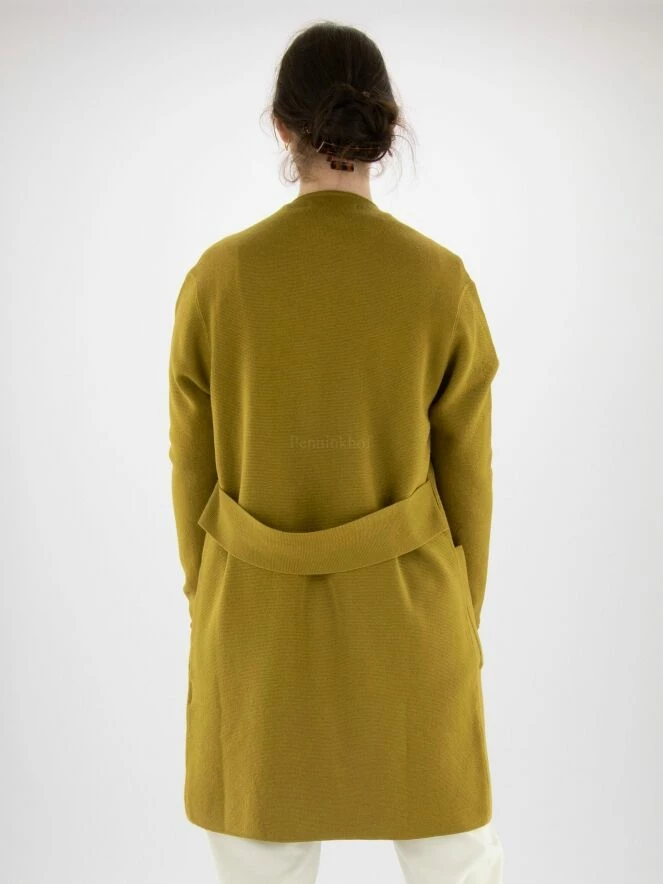 Un luxueux cardigan d’Annette Görtz en jaune ocre. A la taille se trouve une ceinture dans le même tissu que le cardigan. Le cardigan n’a pas de fermeture et peut être lavé à la main.