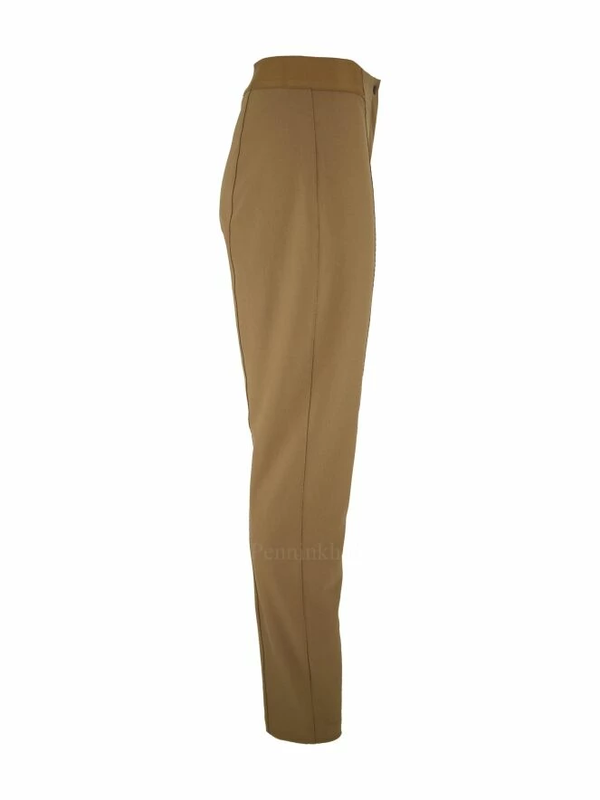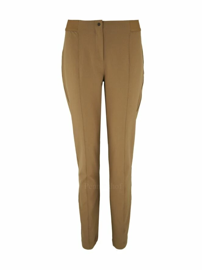 Pantalon de luxe à tissu élastique de couleur camel, de la marque Annette Görtz. Une bande élastique cognac est présente sur les côtés et dans le dos au niveau de la taille. Le milieu des jambes est orné d’une piqûre décorative sur toute sa hauteur. Lavage à 30 degrés.