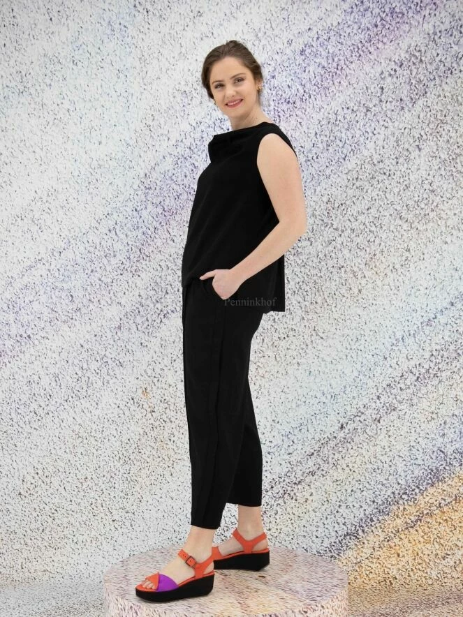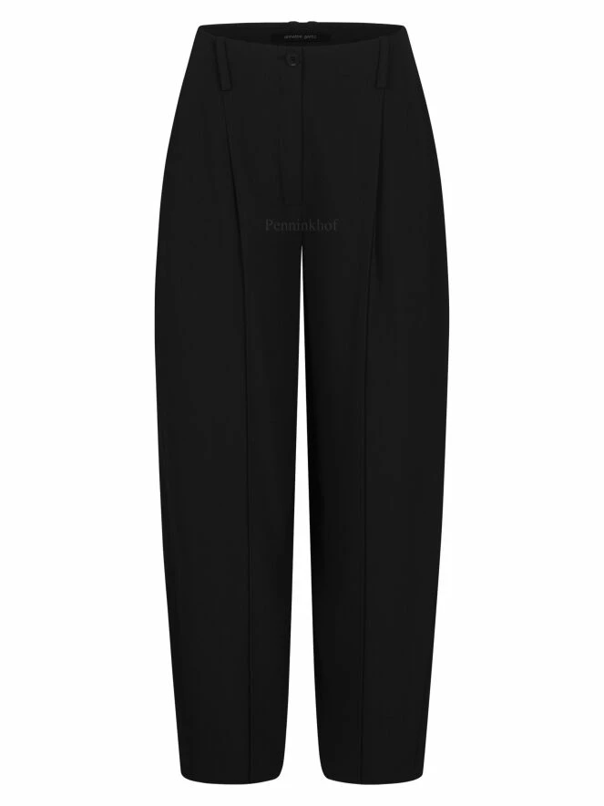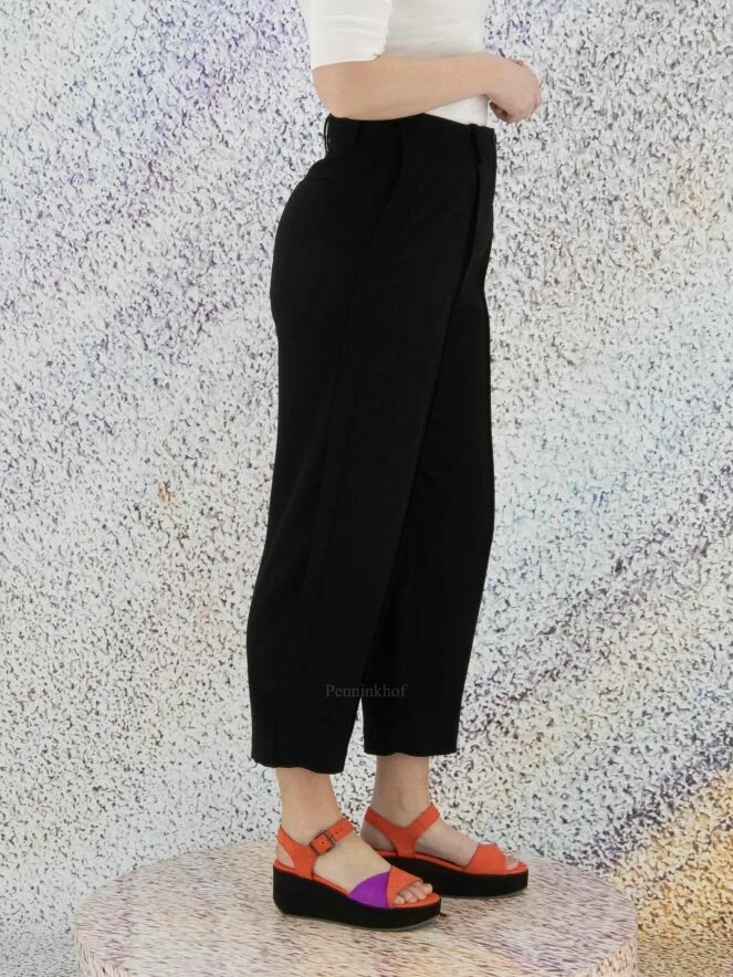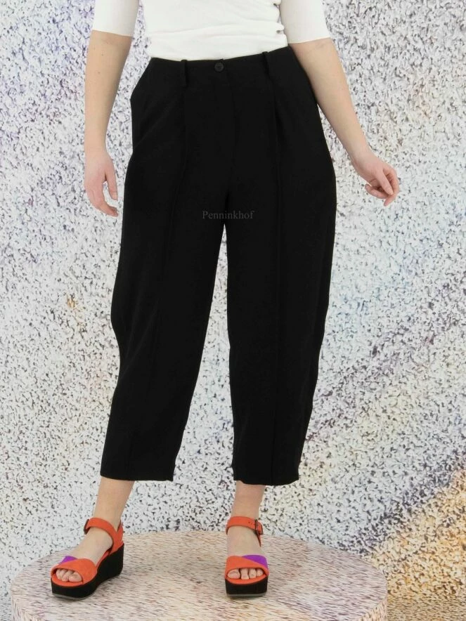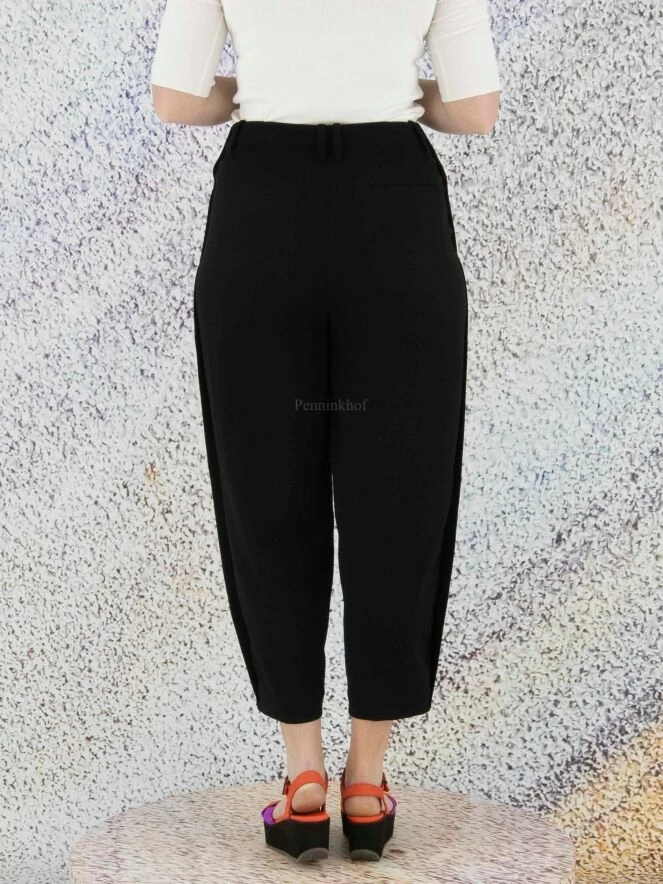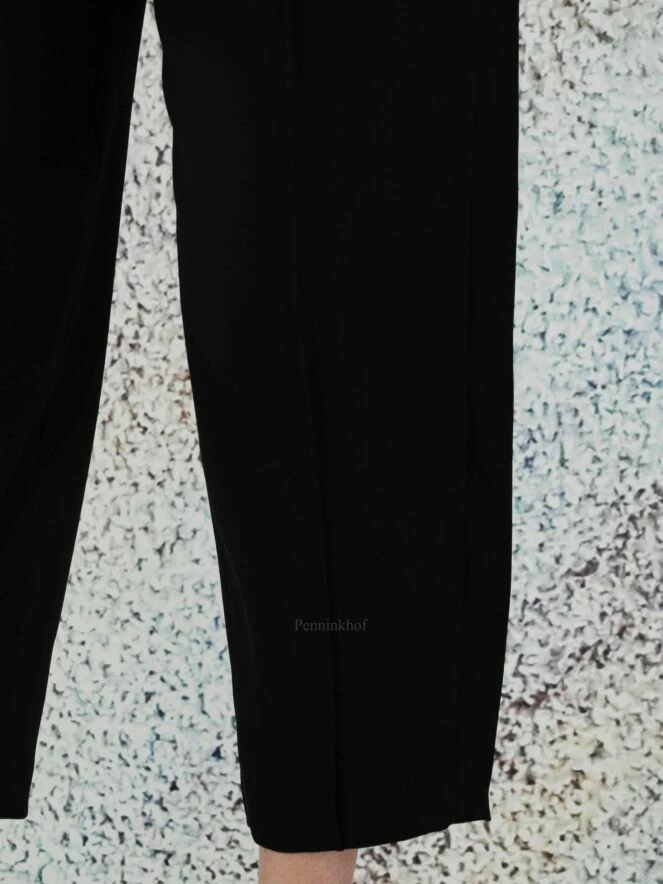 Pantalon de la marque Annette Görtz, de couleur noire. Une pince sur le haut de chaque jambe se transforme en pli jusqu’à l’ourlet du bas. Un passepoil en double tissu orne les côtés. Les jambes sont légèrement fuselées en bas. Lavage à la main.