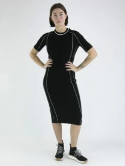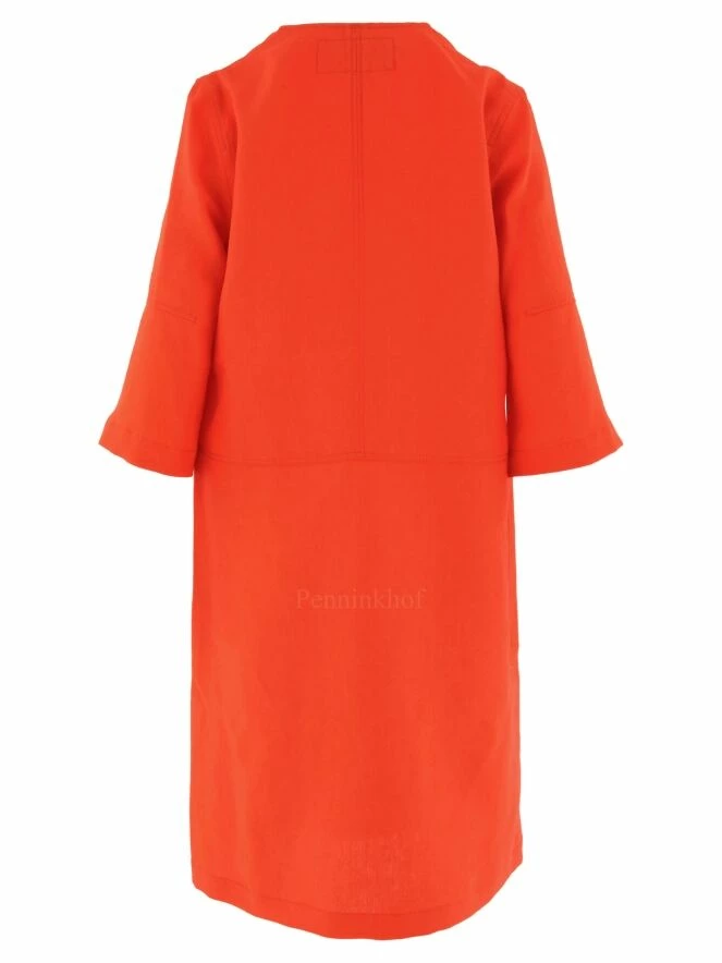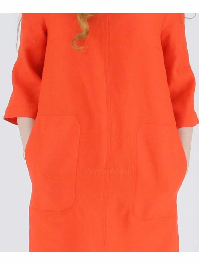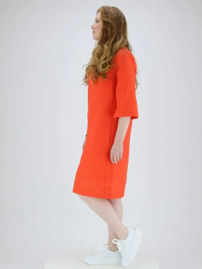 Robe de la marque Annette Görtz, de couleur rouge corail. Col en V et manches mi-longues en forme de cloche. Une double couture centrale descend du col à l’ourlet du bas. Au niveau de la taille, le bord des poches sont à coutures doubles. Lavage à 30 degrés.