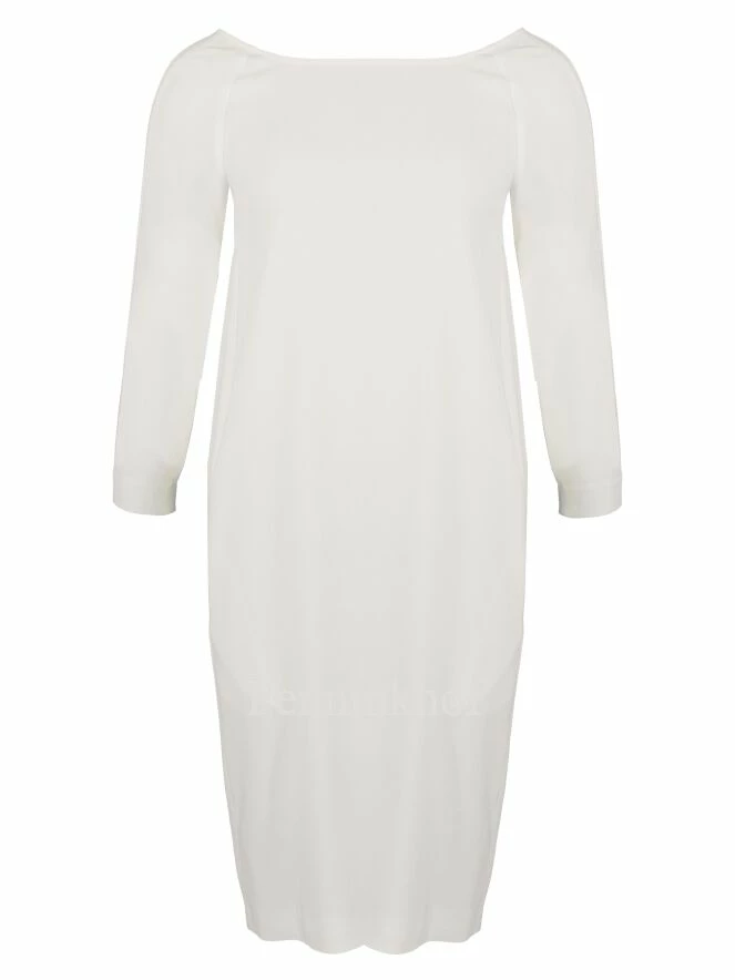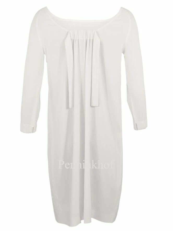 Robe de la marque Annette Görtz, de couleur blanc crème. L’avant présente un large décolleté bateau. À l’arrière, la coupe est un peu plus profonde avec de larges plis centraux descendant jusqu’en bas. D’un large et court élastique démarrant à l’encolure arrière partent 2 rubans descendant jusqu’au milieu du dos. Les extrémités des manches mi-longues ferment à l’aide d’un élastique. La robe est équipée de poches latérales insérées dans le tissu. Lavage à 30 degrés.