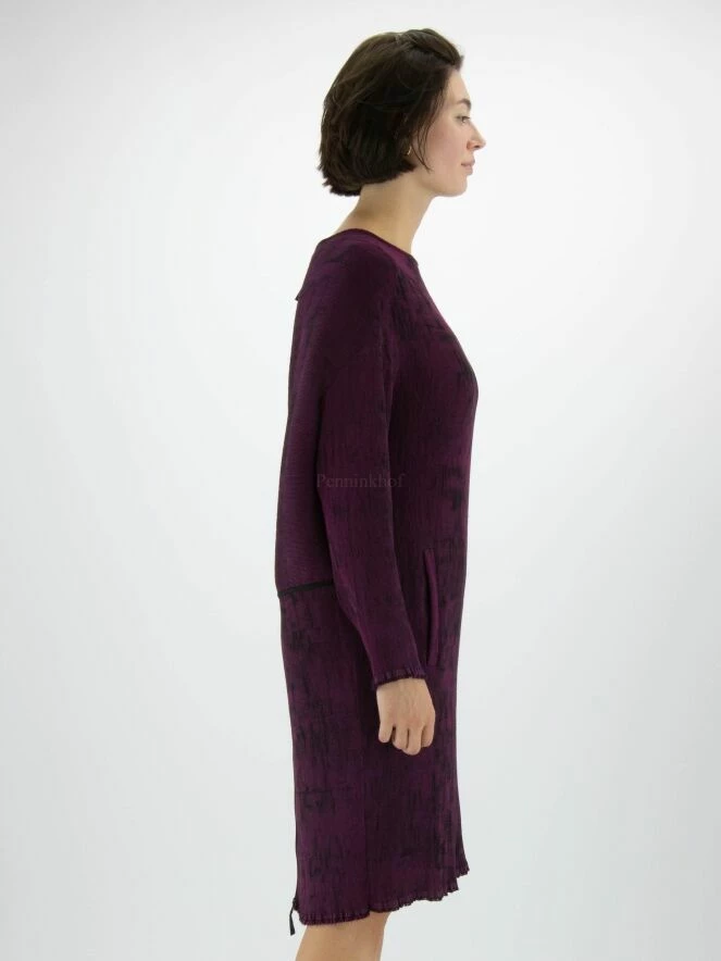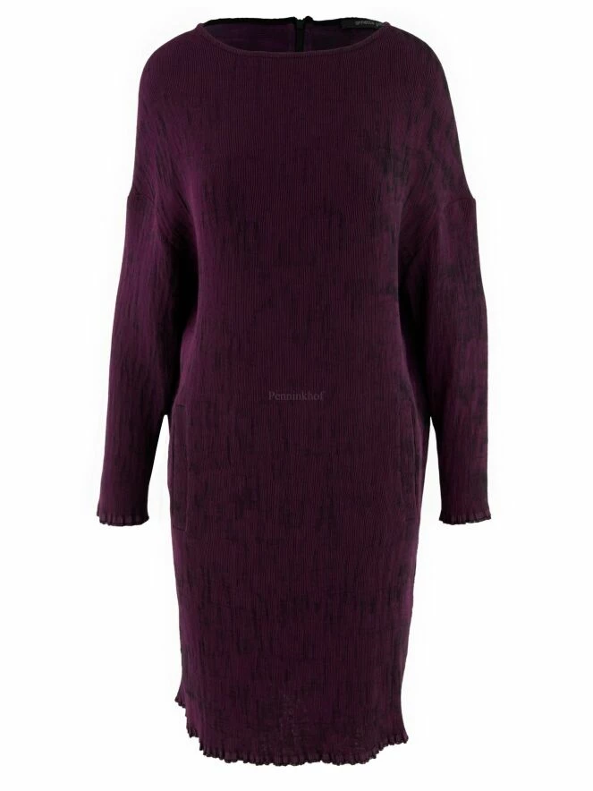 Robe d’Annette Görtz en structure côtelée aux couleurs fuchsia et noir. Au niveau de la taille se trouvent des poches latérales. Dans le dos, une fermeture à glissière s’étend sur toute la longueur de la robe. Au bout des manches longues et au bas de la robe, le tissu est très finement effiloché./ Cette robe peut être lavée à 30 degrés.