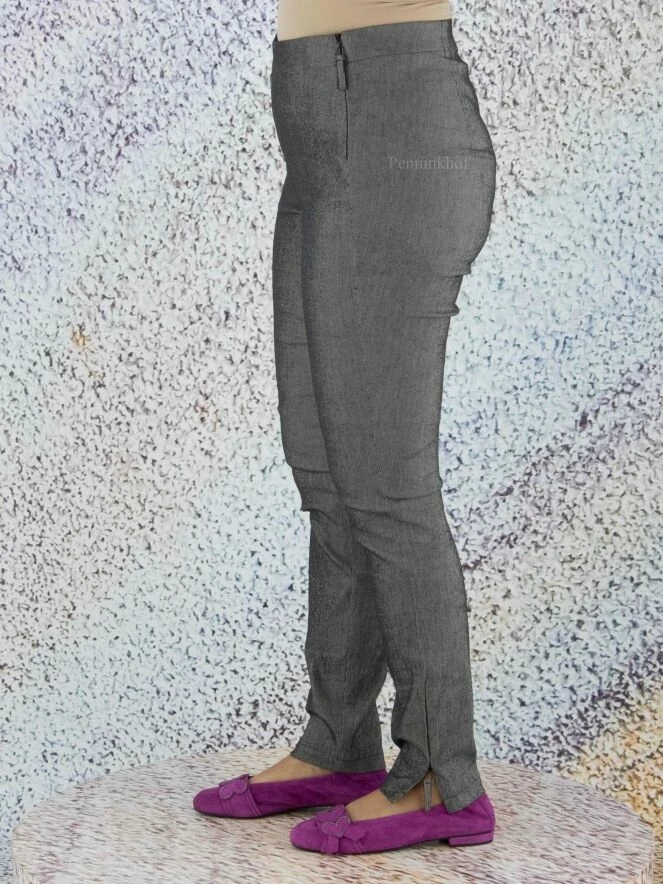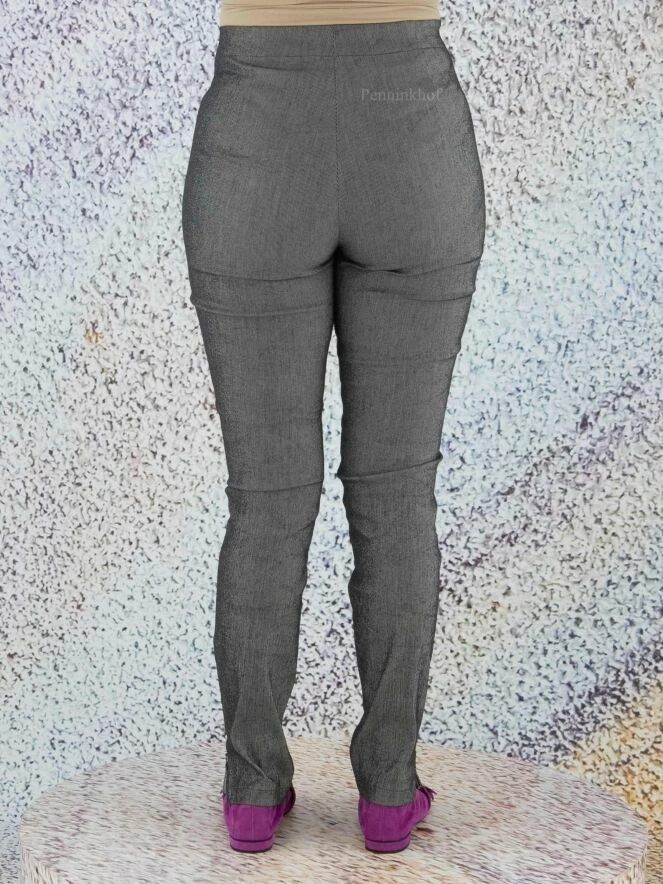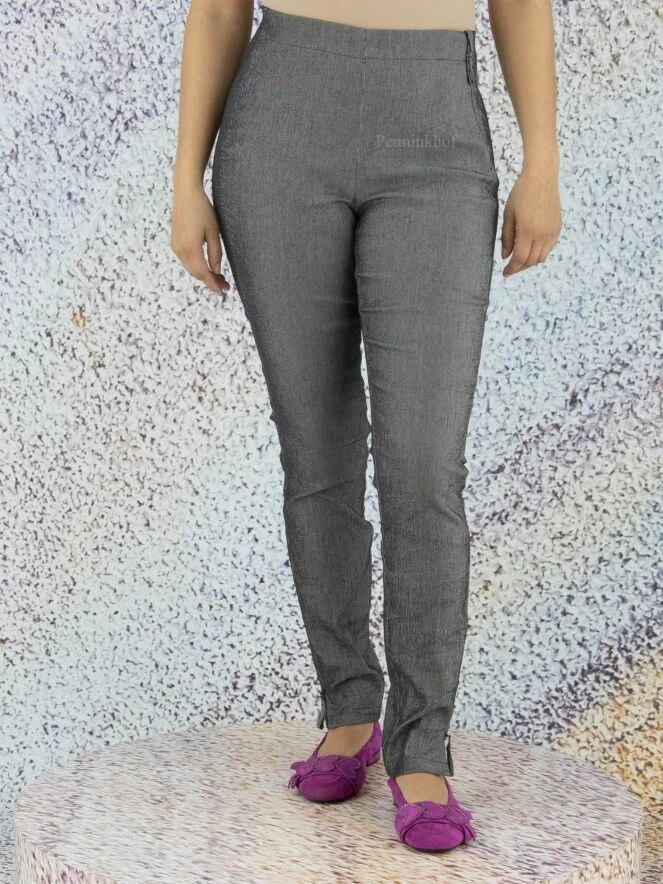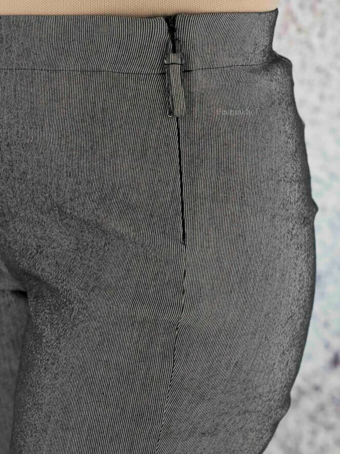 Pantalon de la marque Annette Görtz, à très fines rayures verticales noires et blanc crème, donnant une couleur gris foncé. De la taille élastique descend un zip de fermeture sur le côté gauche. Au bas des jambes, un petit zip à tirettes orne chaque côté. Lavage à 30 degrés.