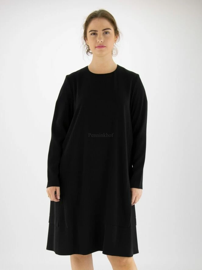 Robe d’Annette Görtz de couleur noire. Sur les côtés, le tissu est ouvert, avec en dessous un tissu noir profond qui apparaît également au bas de la robe. La robe a un col rond et peut être lavée à la main.