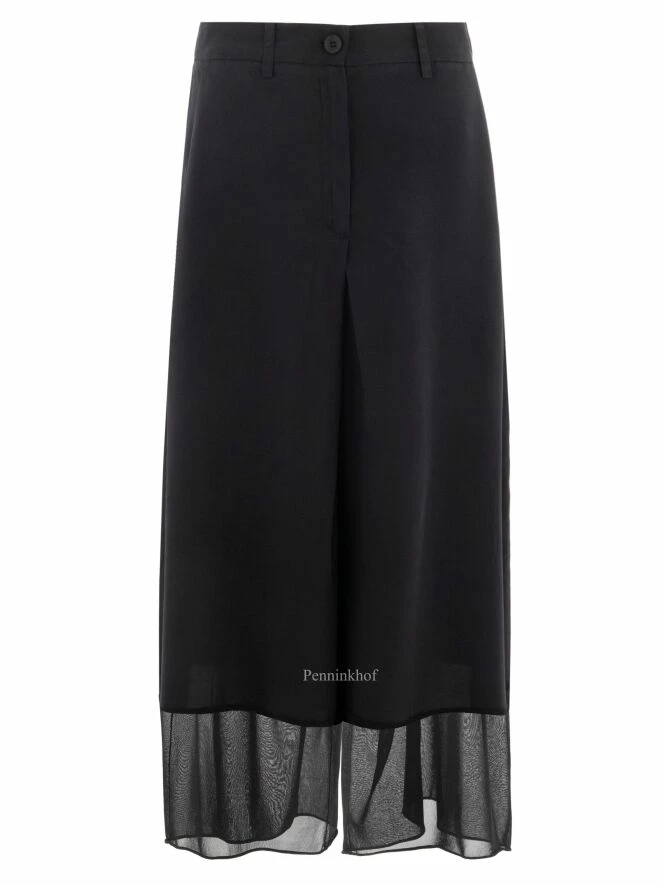Luxueux pantalon large de la marque Annette Görtz, de couleur noire. Au bas des jambes, une partie du tissu est légèrement transparent à partir du mollet. Le pantalon est doté d’une poche arrière droite. Lavage à 30 degrés.