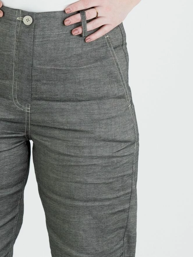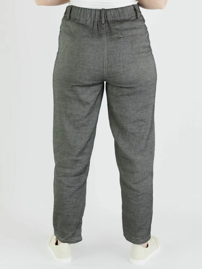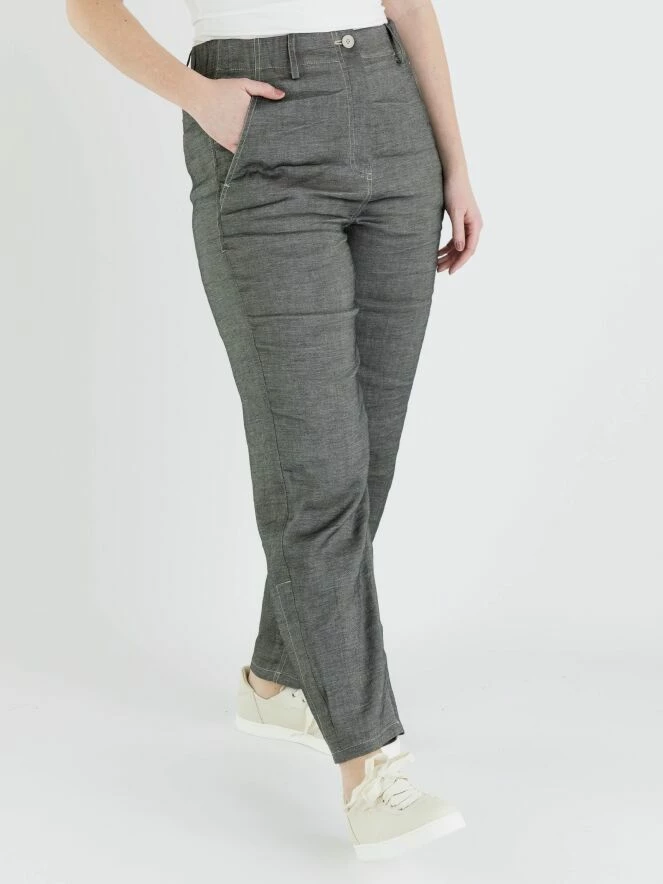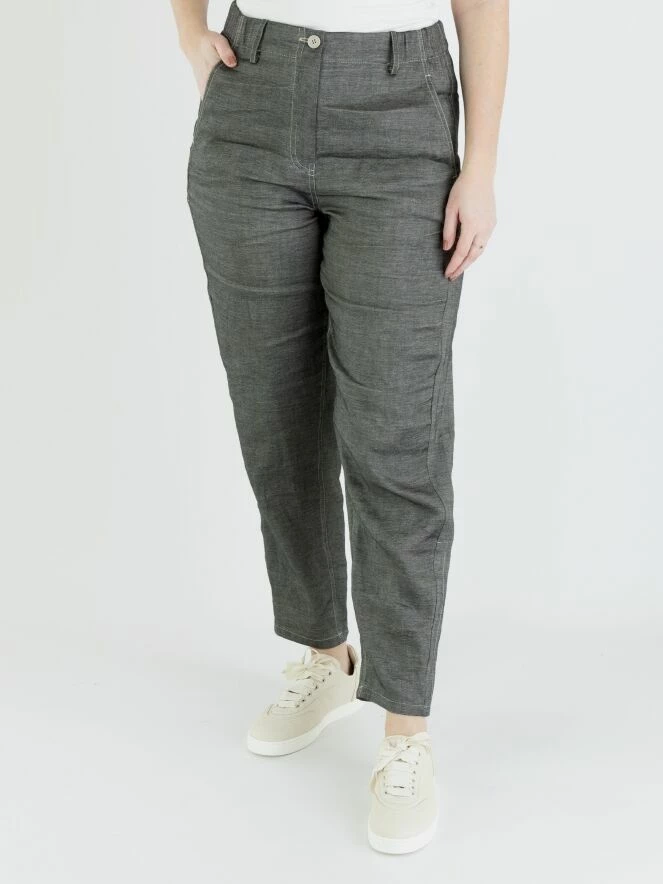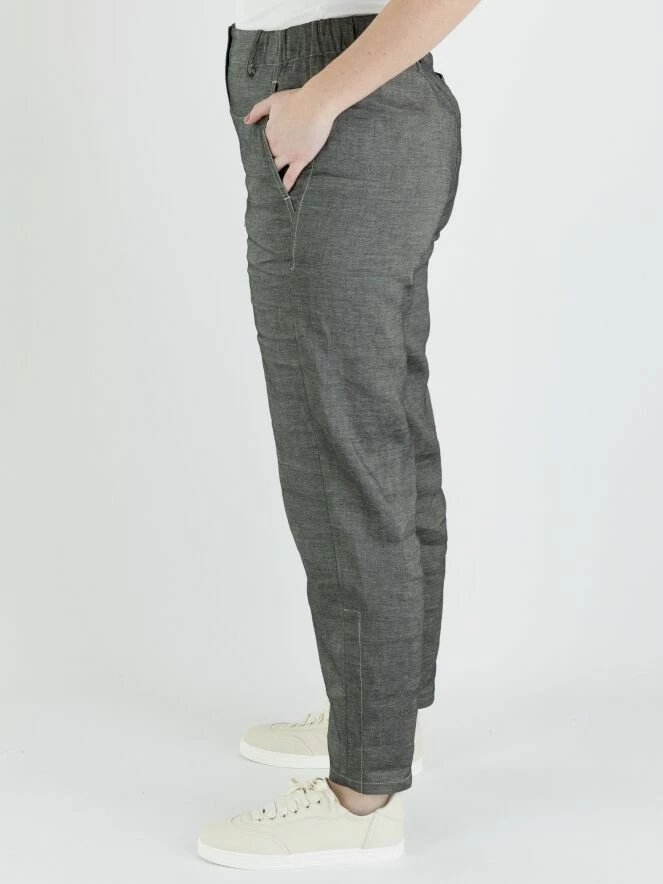 Un pantalon chiné d’Annette Görtz dans une couleur gris foncé. À l’arrière, il y a une large bande finement côtelée à la taille. Le pantalon a des poches latérales et peut être lavé à la main.
