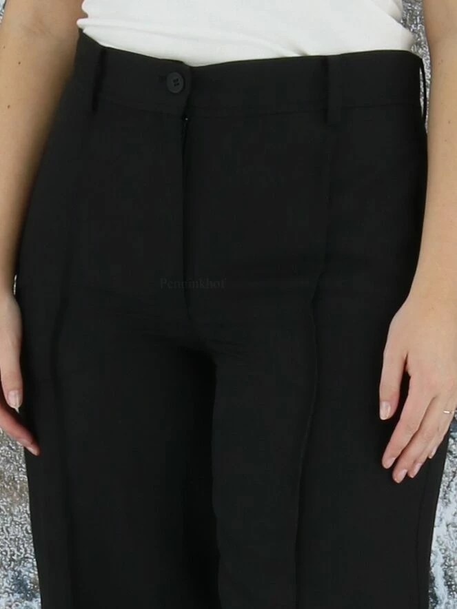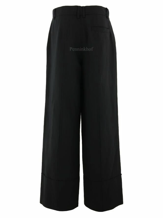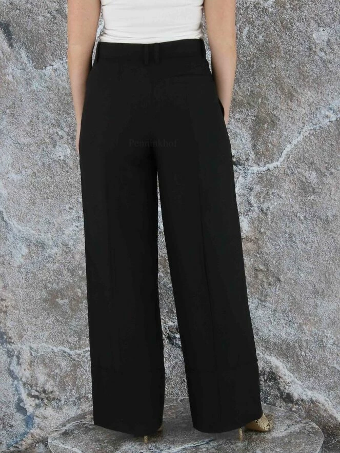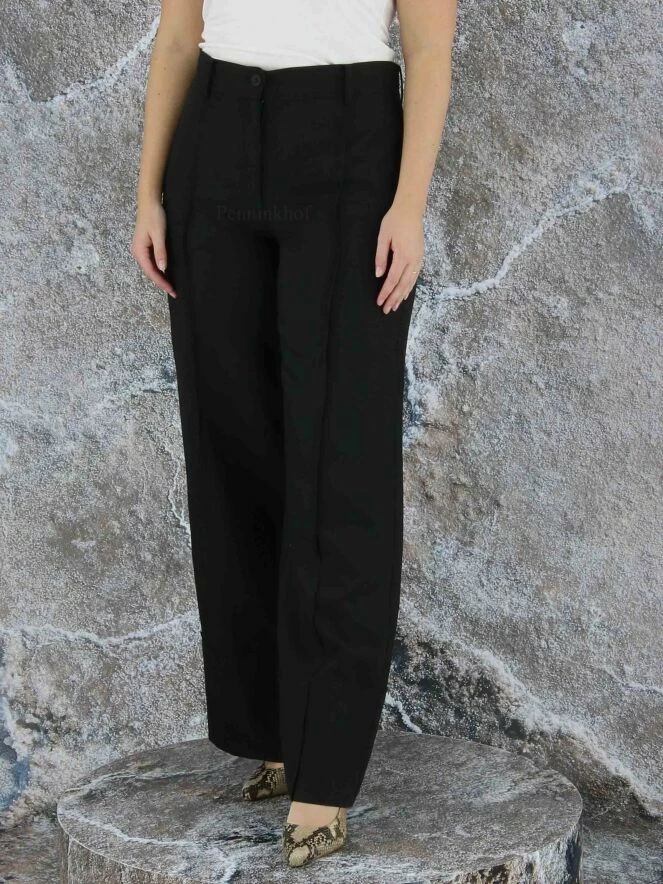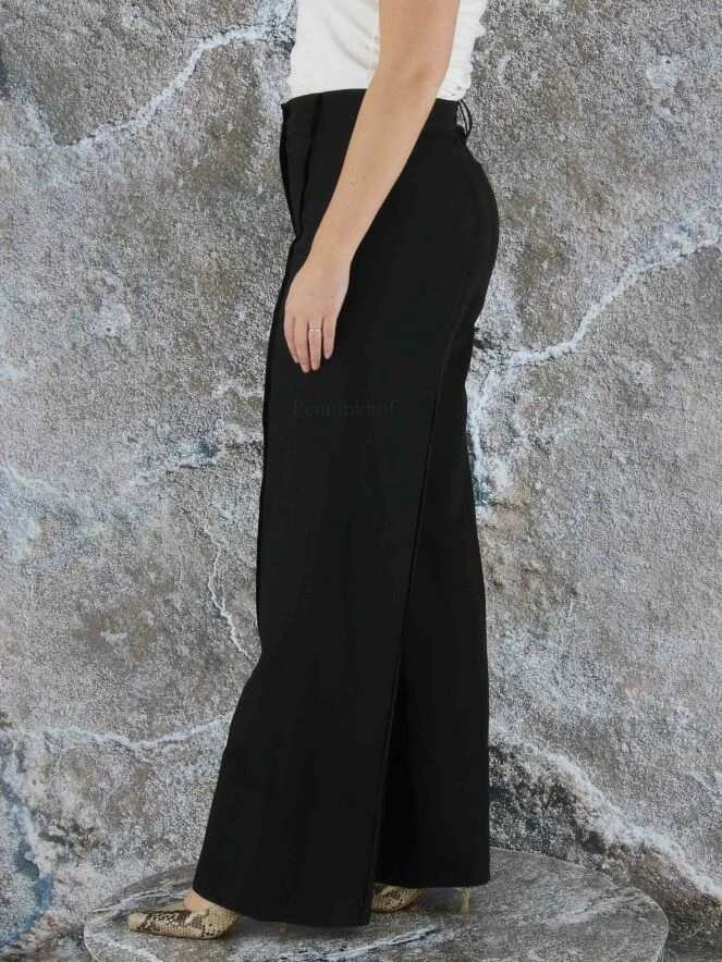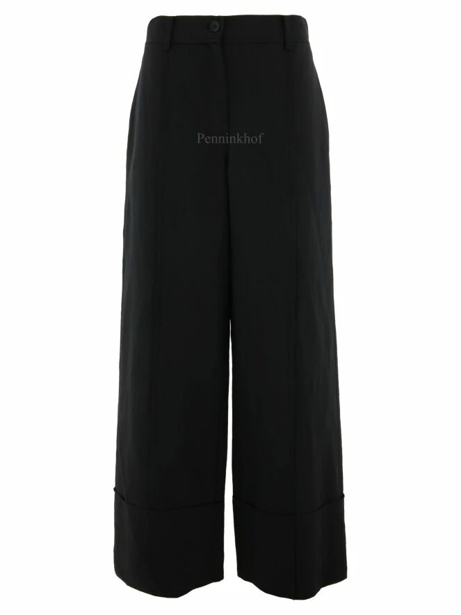 Pantalon à jambes larges de la marque Annette Görtz, de couleur noire. Au bas des jambes se trouve une couture horizontale qui crée un faux revers. Les jambes sont ornées d’une couture centrale à l’avant et à l’arrière. Lavage à 30 degrés.