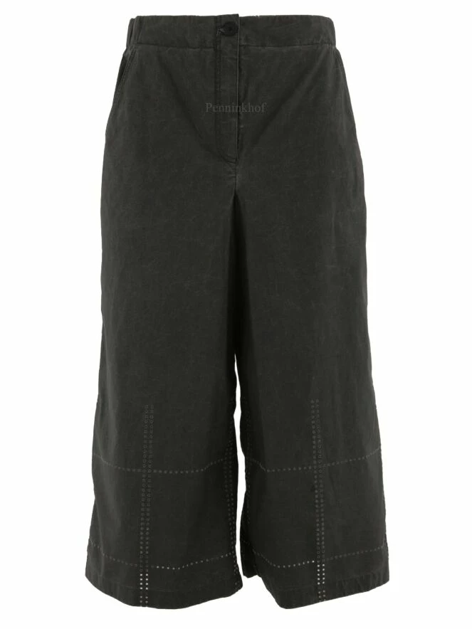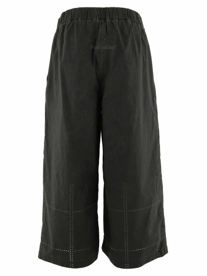 Pantalon large de la marque Annette Görtz, de couleur anthracite. La taille est équipée d’une bande élastique froncée à l’arrière. Le pantalon est orné de lignes verticales et horizontales ajourées qui se croisent sous les genoux. Le pantalon présente des poches latérales. Lavage à 30 degrés.