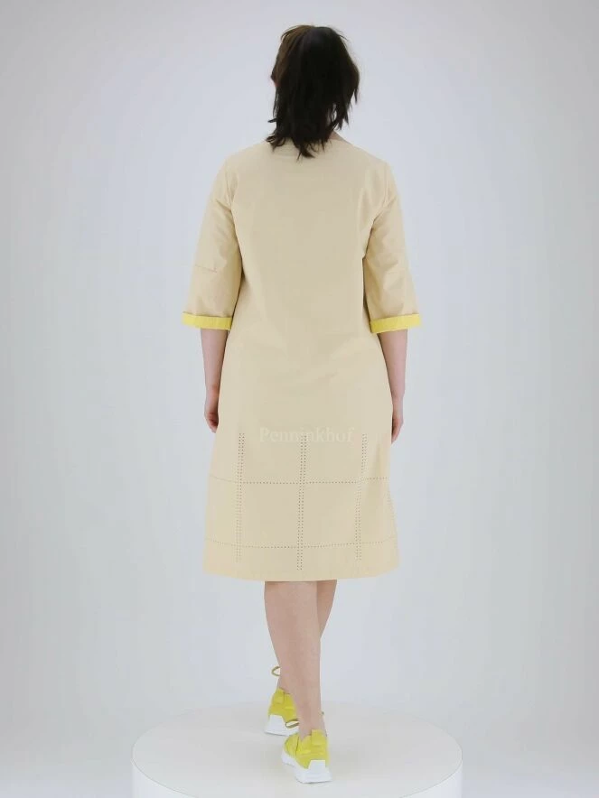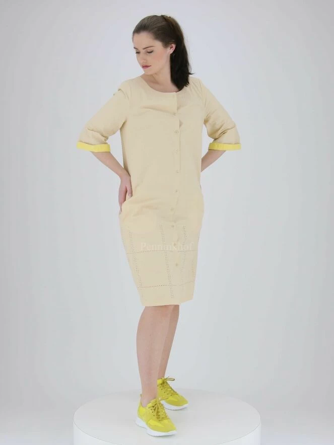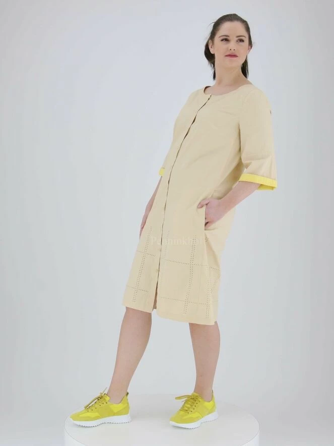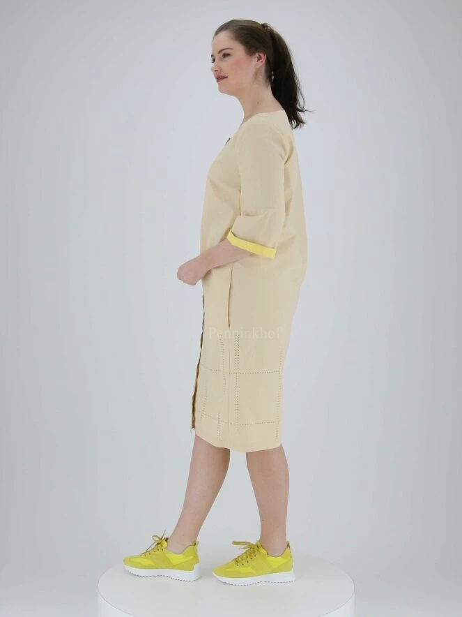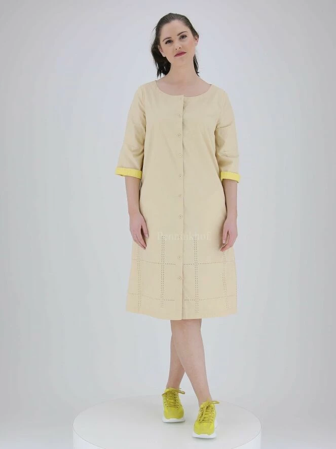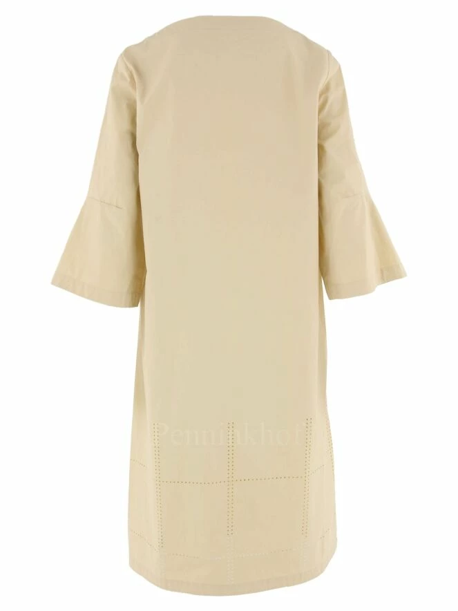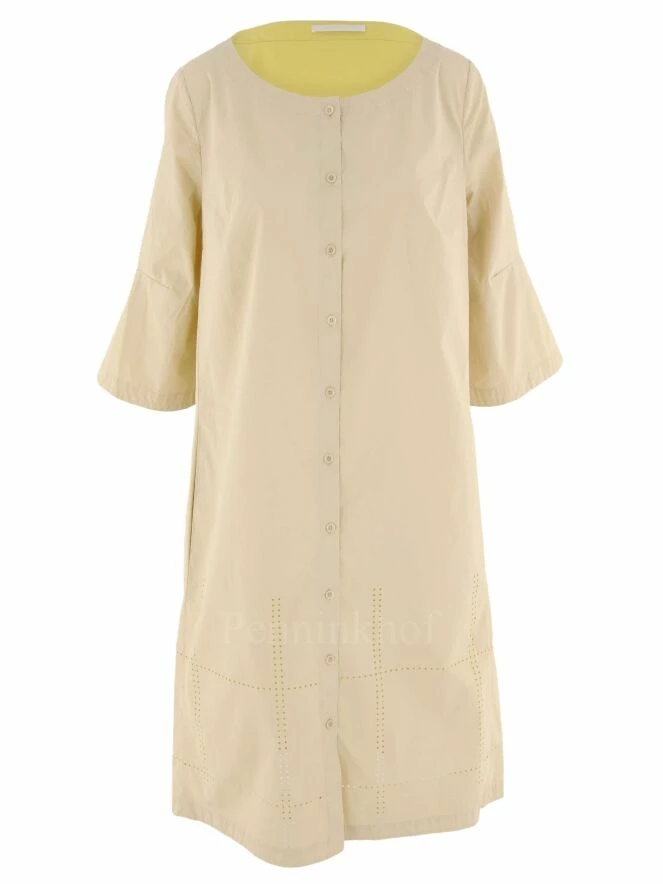 Robe boutonnée de la marque Annette Görtz, coloris vanille. La robe présente un col rond et des manches mi-longues évasées. A partir du genou, des lignes horizontales et verticales ajourées quadrillent la partie inférieure. Lavage à 30 degrés.
