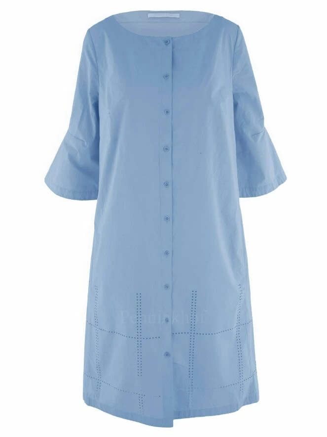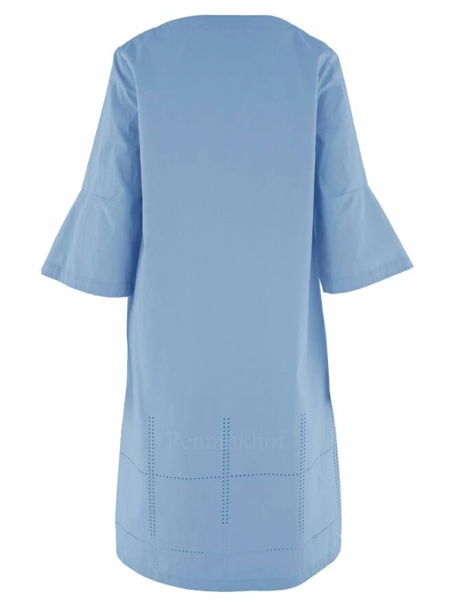 Robe boutonnée de la marque Annette Görtz, de couleur bleu clair. La robe présente un col rond et des manches mi-longues évasées. A partir du genou, des lignes horizontales et verticales ajourées quadrillent la partie inférieure. Lavage à 30 degrés.