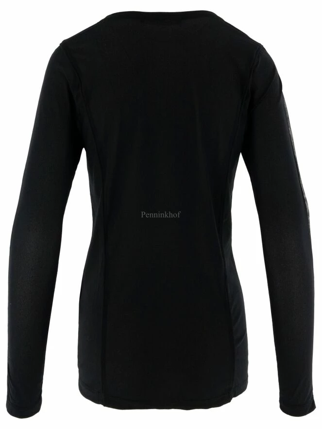 Une chemise d’Annette Görtz en noir avec un motif de surpiqûres en blanc crème et marron moka. La T – shirt a un col rond et peut être lavée à 30 degrés.