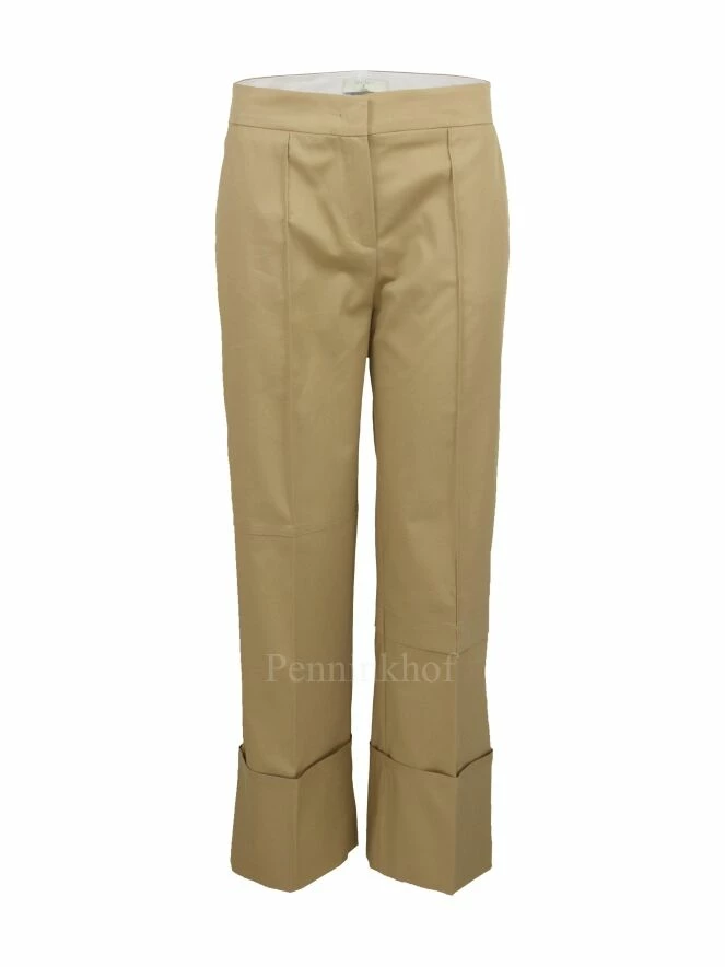 Pantalon blanc de la marque Beatrice B., de couleur chamois. Sous le genou gauche, un pli cousu imite un revers. Le bas des jambes présente de très larges revers de 15 cm. Le pantalon est équipé de poches fendues. Lavage à la main.