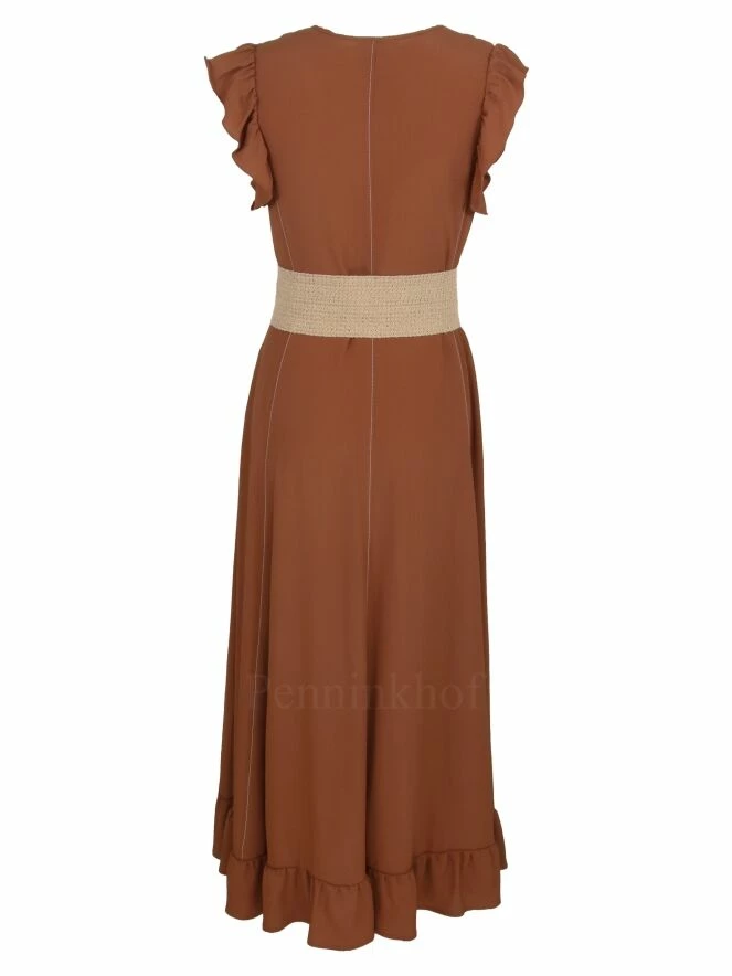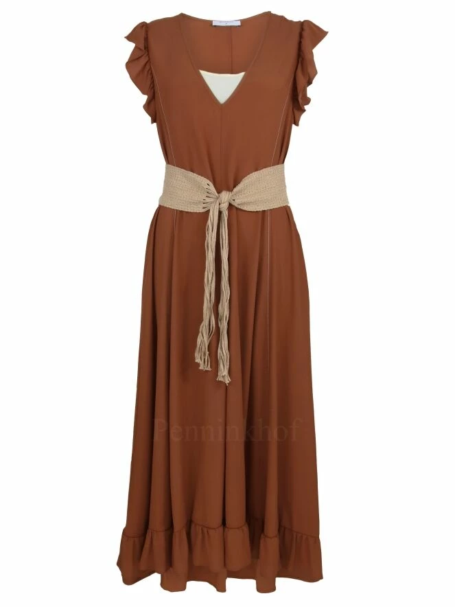 Robe sans manches de la marque Beatrice B., de couleur marron. La robe présente un col en V doublé en partie dans un tissu écru. Les emmanchures et le bas de la robe sont bordés de volants. De très fines coutures blanches s’étendent sur toute la hauteur de la robe sur les côtés, à l’avant et dans le dos. À partir de la taille, la robe présente une ligne A. La robe est équipée de poches latérales insérées dans le tissu. Lavage à la main.