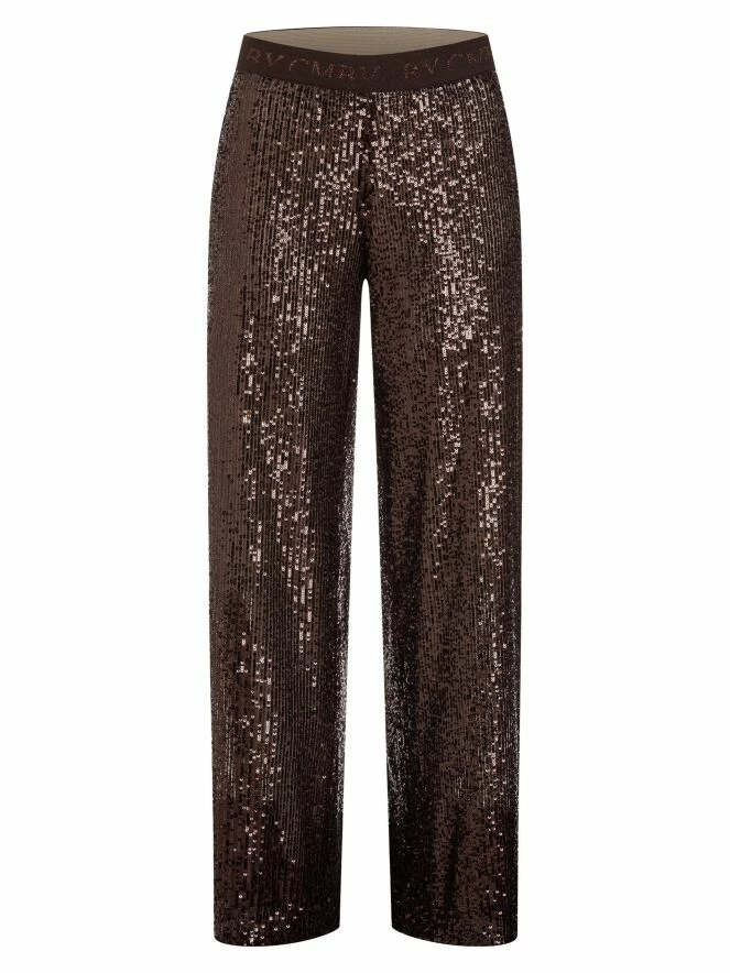 Pantalon droit de la marque Cambio, de couleur bronze. Le pantalon est recouvert de paillettes de la même couleur que le tissu. La taille est équipée d’un élastique marron à lettrage brillant. Lavage à la main.
