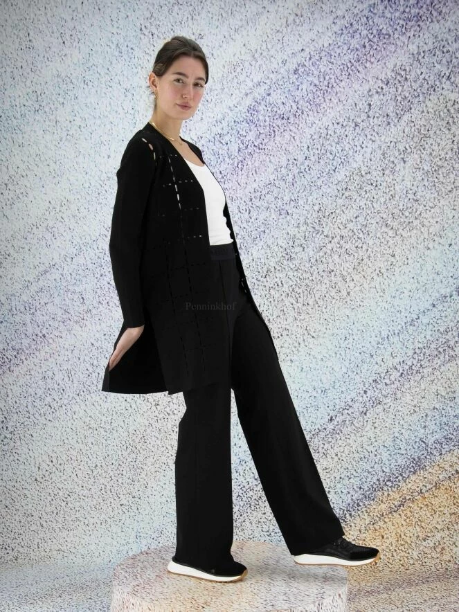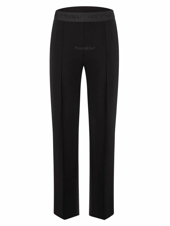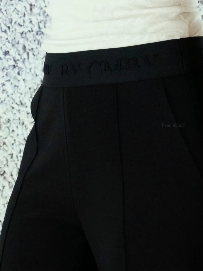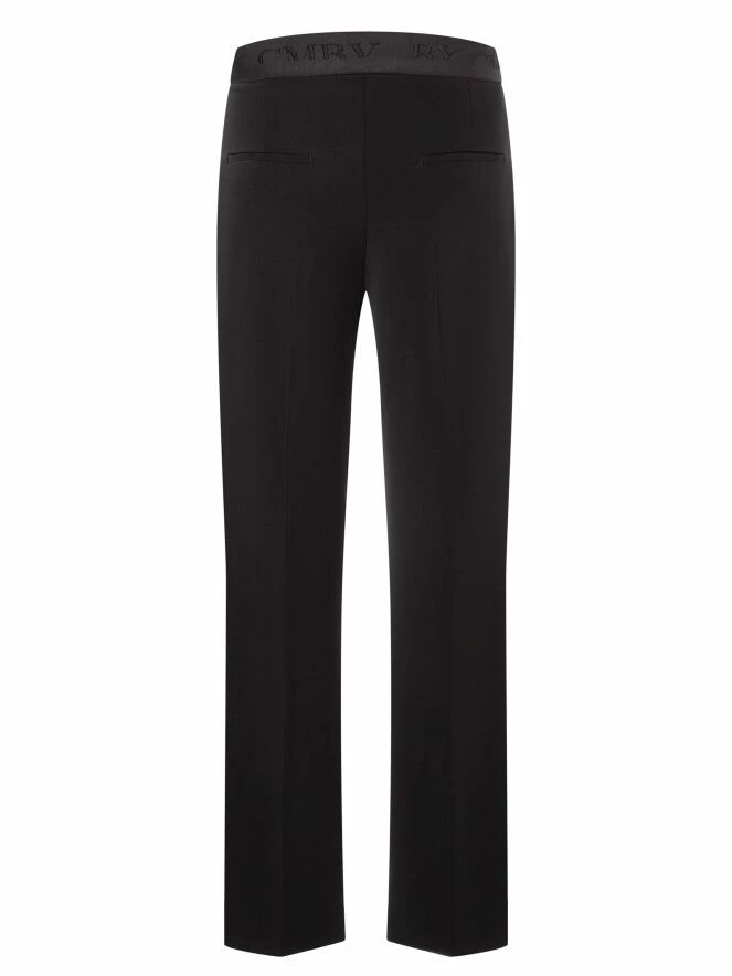 Pantalon à la coupe droite de la marque Cambio, de couleur noire. La taille est élastiquée. Une couture centrale en relief orne la jambe sur toute sa hauteur. Le pantalon est doté de poches latérales. Lavage à 30 degrés.