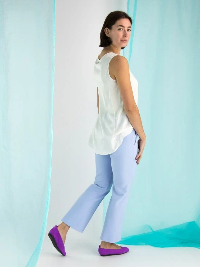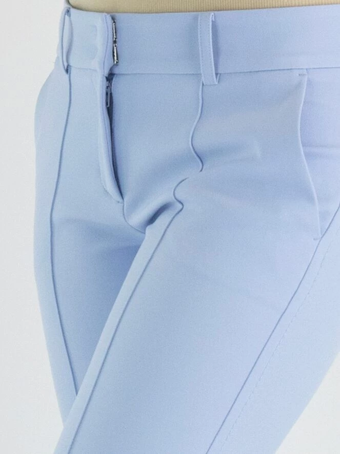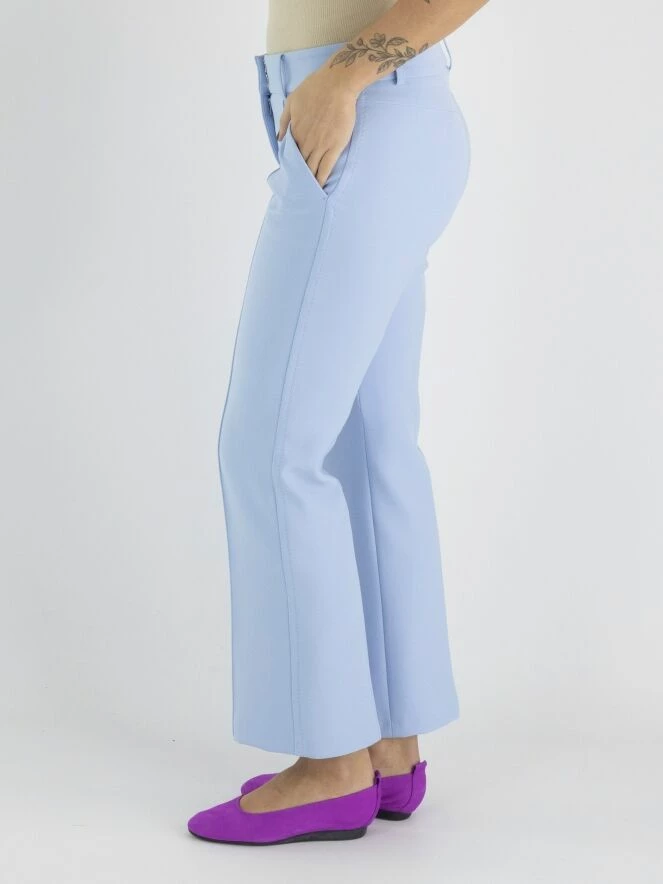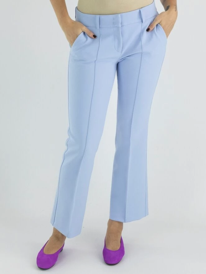 Un pantalon de Cambio en couleur lavande. Sur les côtés, il y a une couture décorative. Il y a également une couture au milieu des jambes. Le pantalon a des poches latérales et peut être lavé à 30 degrés.