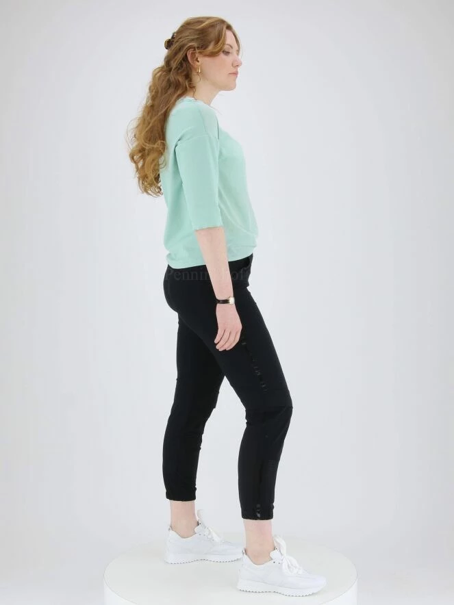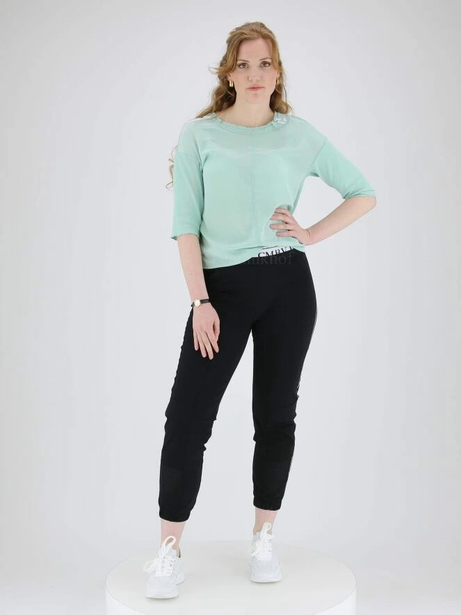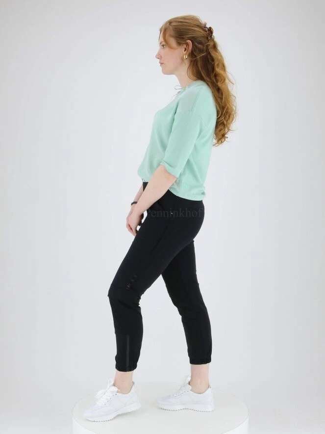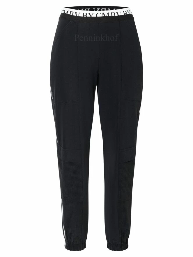 Pantalon de la marque Cambio, de couleur noire. La taille est équipée d’une bande élastique de couleur blanche et noire imprimée d’un texte noir tissé. Le bas des jambes présente une fine bande élastique froncée. Une garniture laquée noire orne les côtés extérieurs des jambes. À hauteur des mollets, des poches décoratives en tissu ajouré sont présentes. Lavage à 30 degrés.