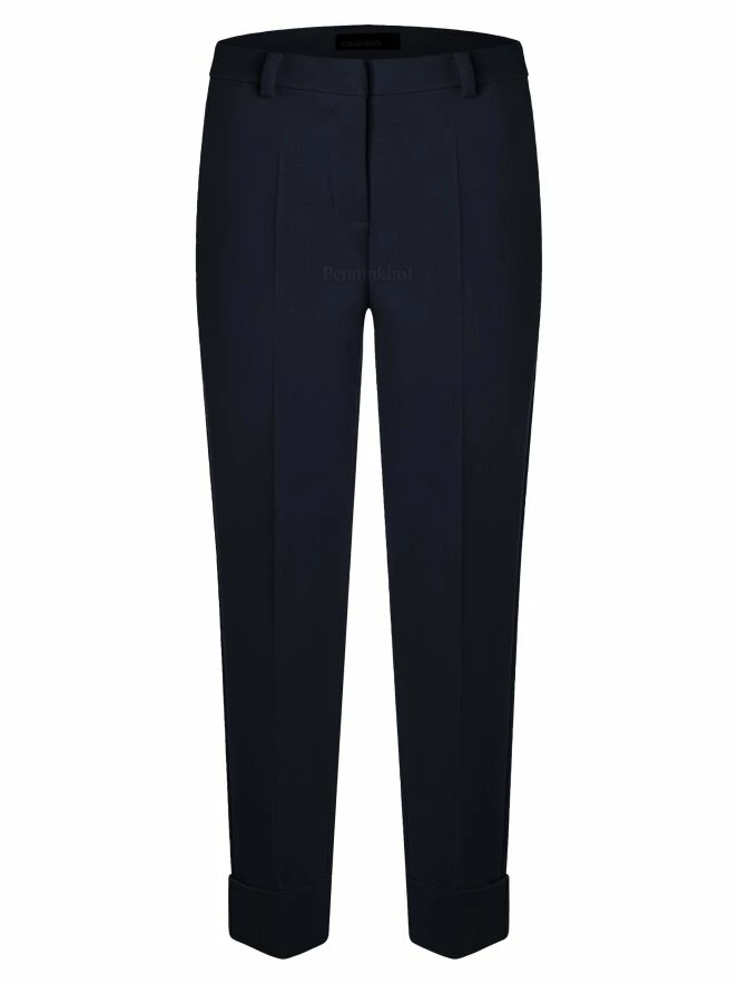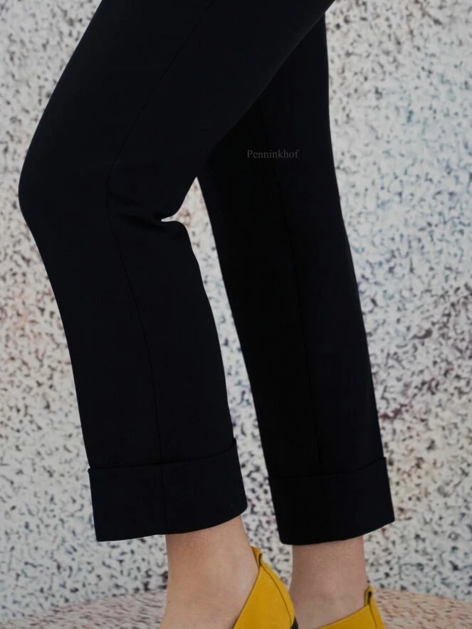 Pantalon de la marque Cambio, de couleur noire. Le pantalon est équipé de poches latérales. Il est orné d’un pli de repassage sur l’avant et l’arrière de la jambe. Un large revers est présent au bas des jambes. Lavage à la main.