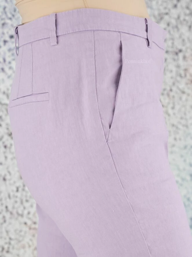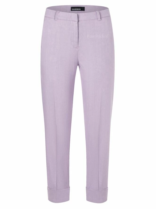 Pantalon de la marque Cambio, de couleur lilas. Le pantalon est doté de poches latérales et d’un large revers au bas des jambes. Lavage à la main.