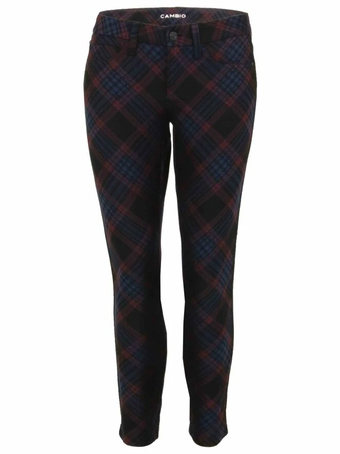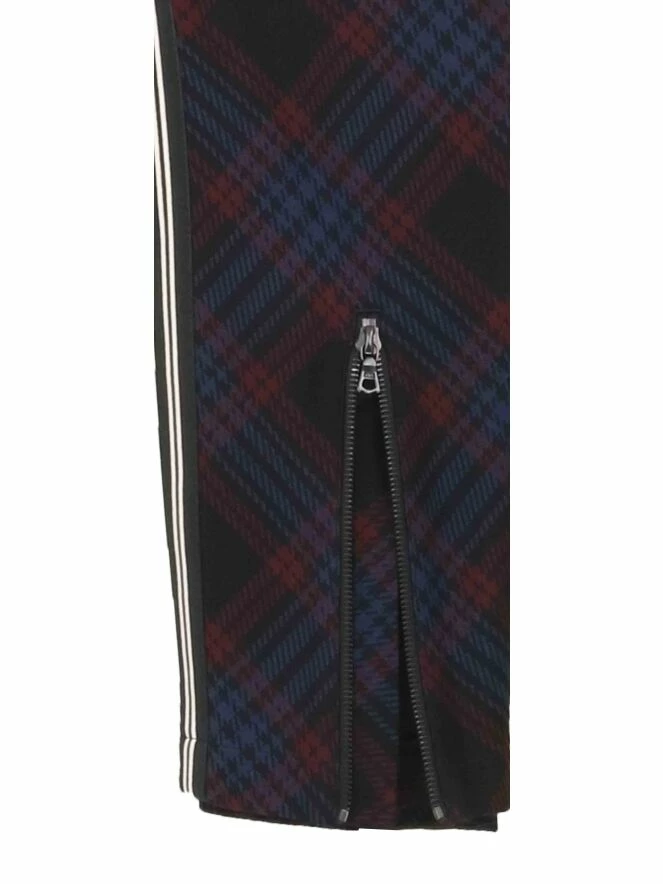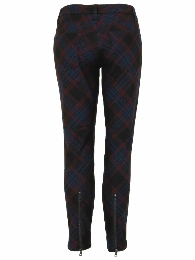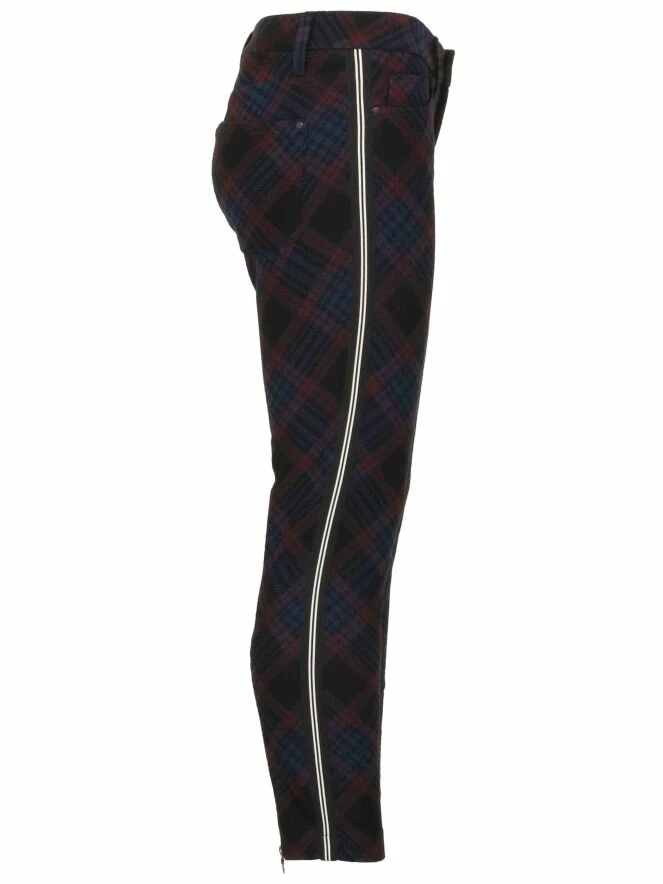 Pantalon de coupe ajustée, de la marque Cambio, imprimé d’un motif de croisillons aux couleurs rouge bordeaux et bleu nuit sur fond noir. Sur les côtés, le pantalon présente une bande noire à rayures blanches. L’arrière des jambes présente des zips sur la hauteur du mollet. Modèle à 5 poches. Lavage à la main.