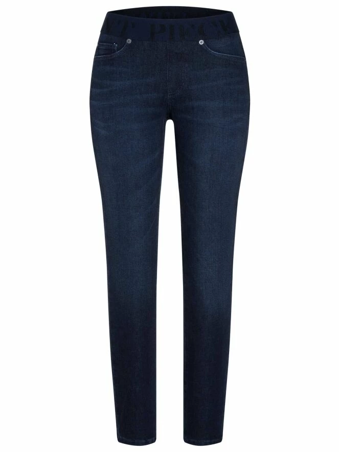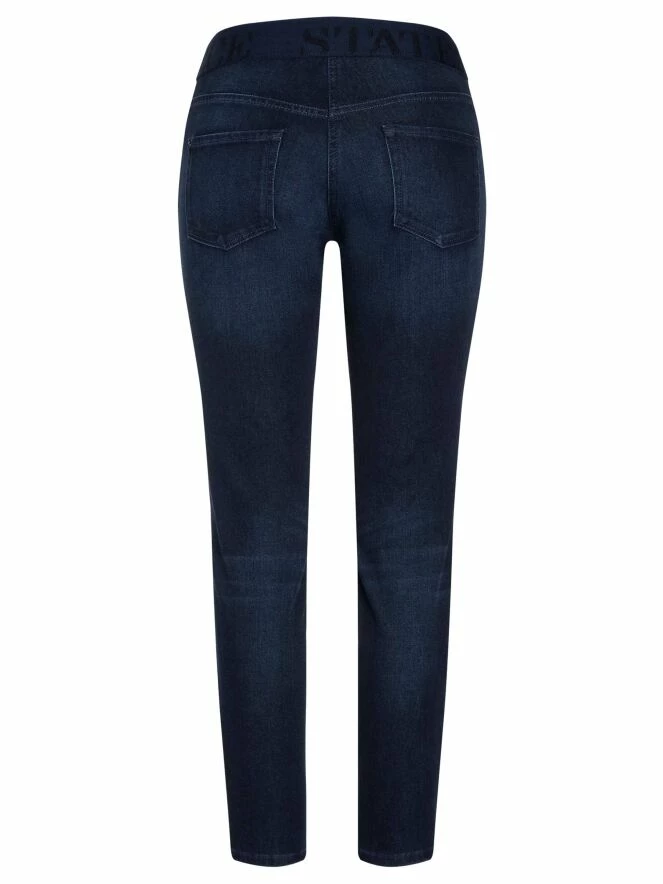 Jeans à la coupe ajustée, de la marque Cambio, en denim de couleur bleu jeans. Il est équipé d’un large élastique à la taille avec marquage en lettres noires. Modèle à 5 poches. Lavage à 30 degrés.