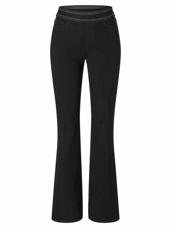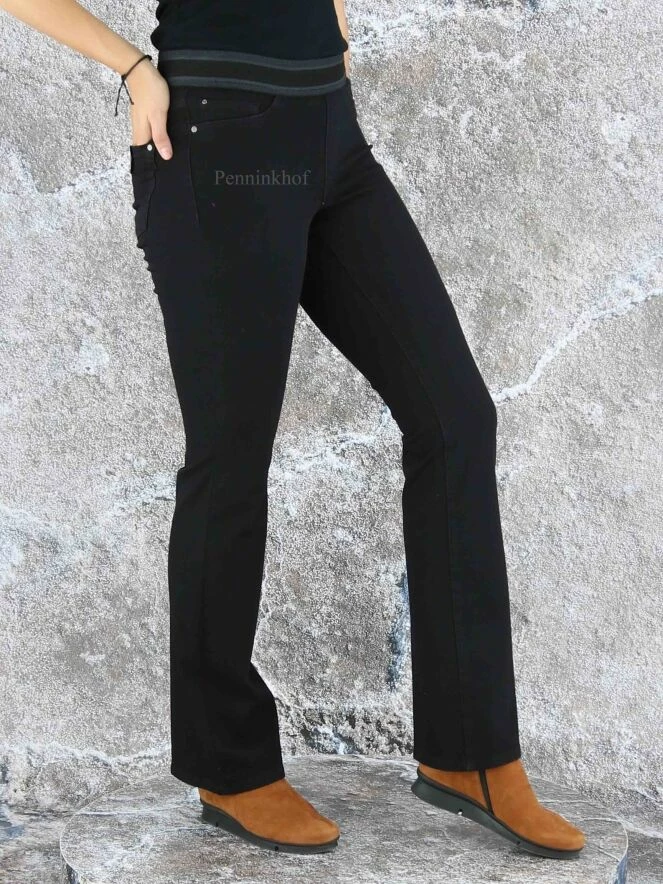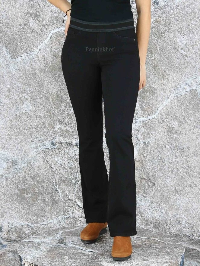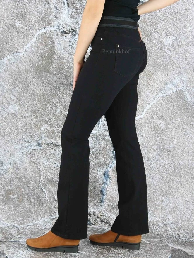 Jeans évasé de la marque Cambio, de couleur noire. Le jean est équipé d’une bande élastique à la taille. Modèle à 5 poches et peut être lavé à 30 degrés.