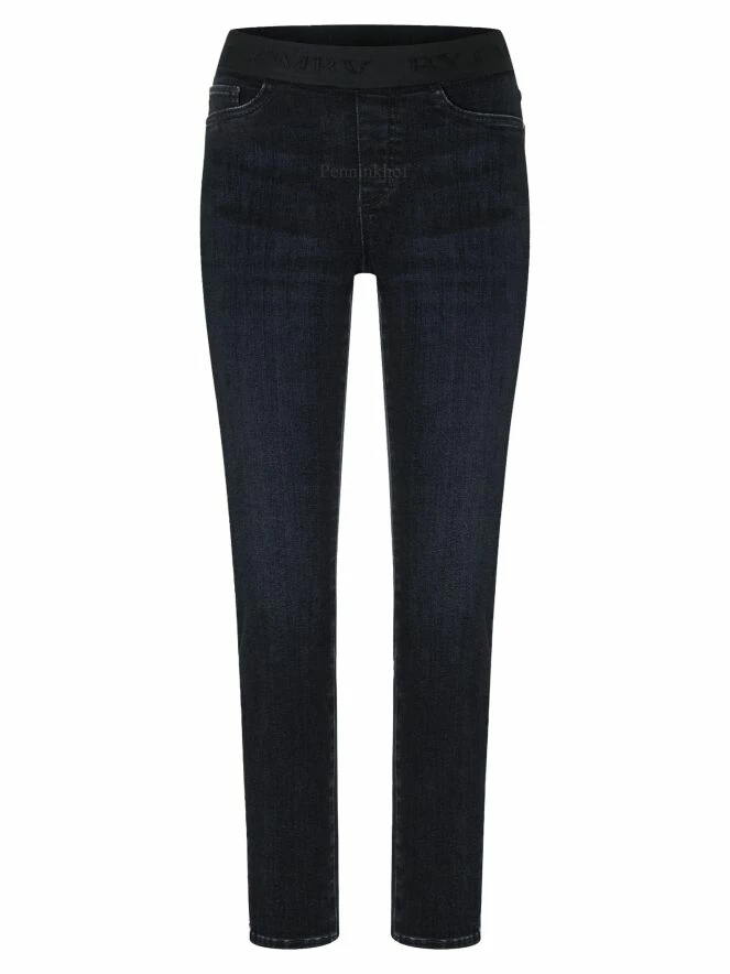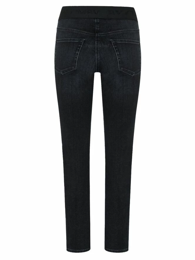 Jeans de Cambio en anthracite. La taille est élastiquée avec un fil métallique noir tissé à travers l’élastique. Le jeans est un modèle à 5 poches et peut être lavé à 30 degrés.