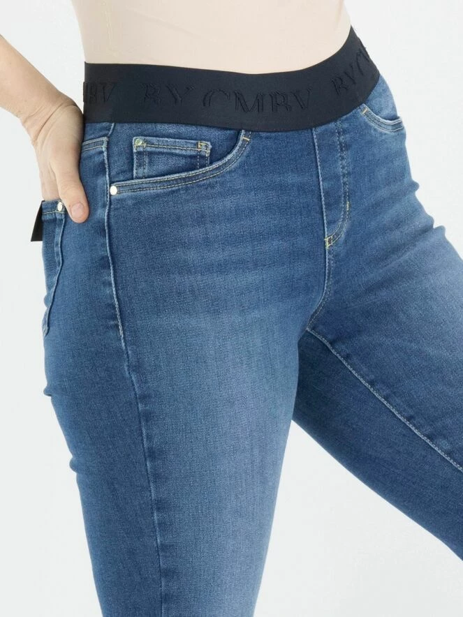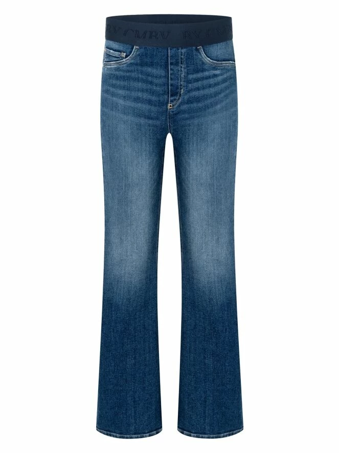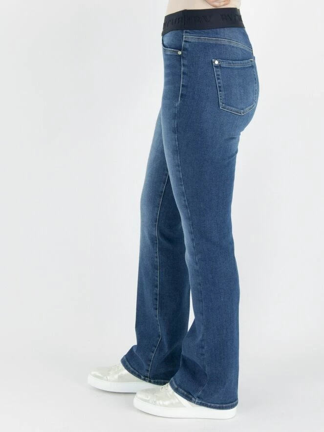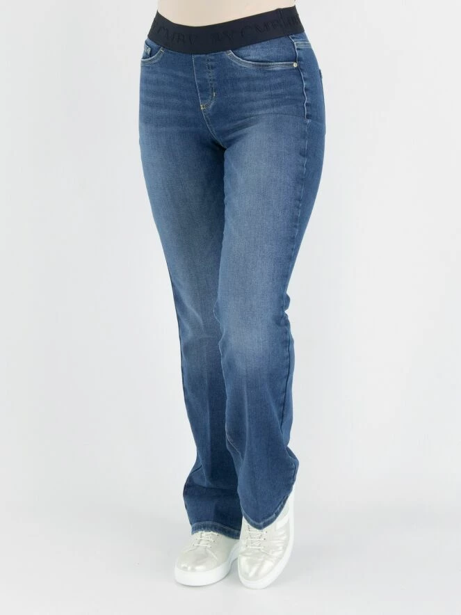 Un jean évasé de Cambio dans une couleur de denim basique. Le jean est dans un modèle à 5 poches et possède une large bande élastique à la taille. Ce jean peut être lavé à 30 degrés.