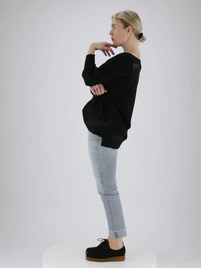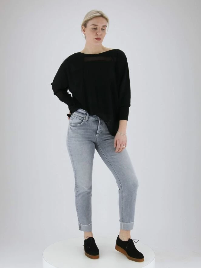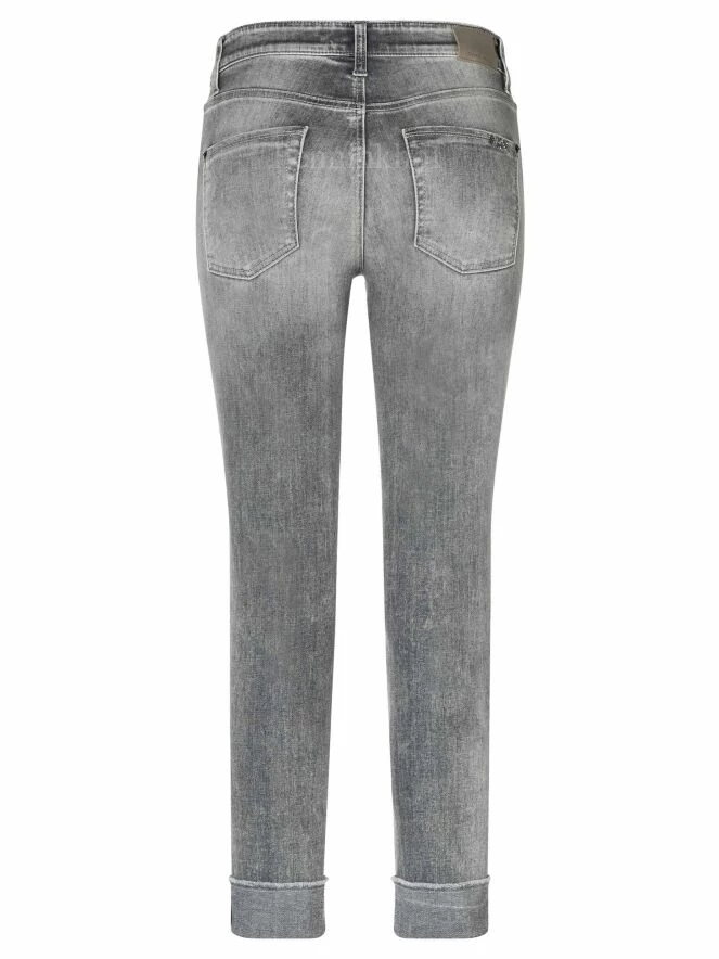 Jeans délavé de la marque Cambio, de couleur grise. Modèle à 5 poches. Un revers habille le bas des jambes orné d’une courte bande de strass. Lavage à 30 degrés.