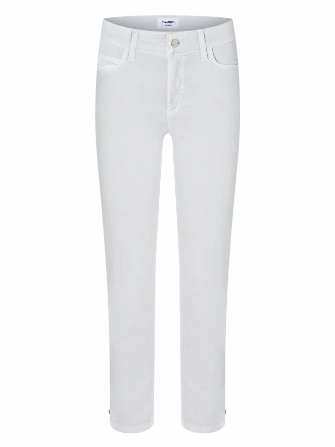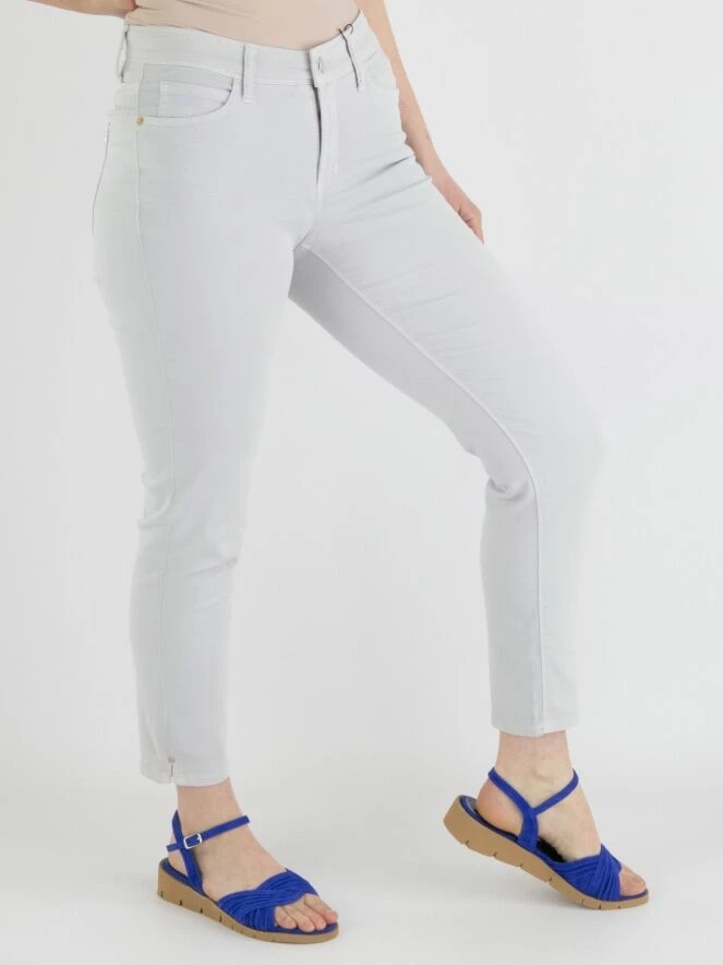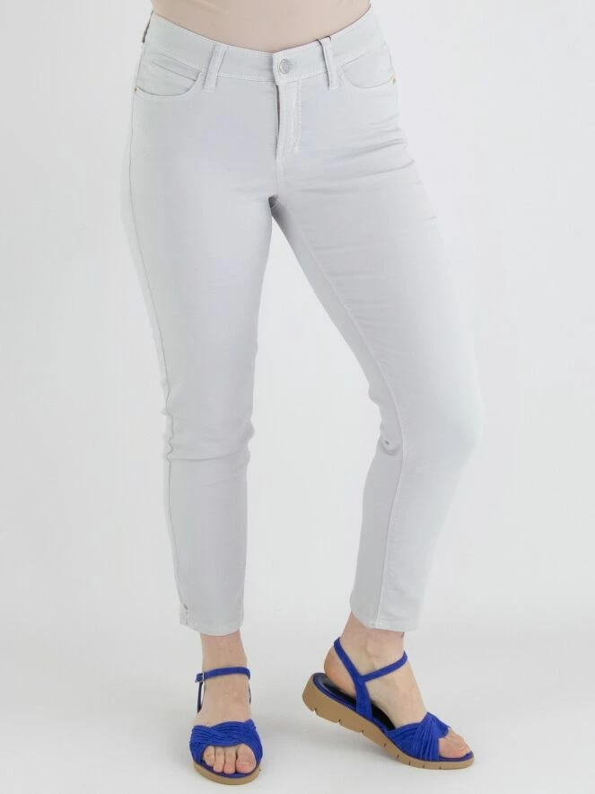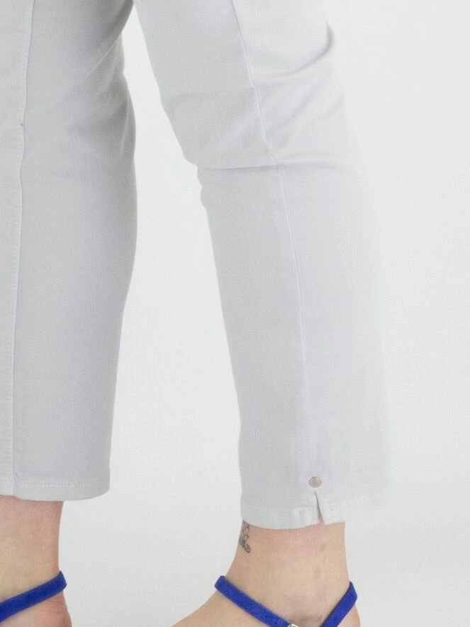 Un jean court de Cambio en gris clair. Au bas des jambes, il y a une petite fente sur les côtés avec un petit clou. Le jean est dans un modèle à 5 poches et peut être lavé à 30 degrés.