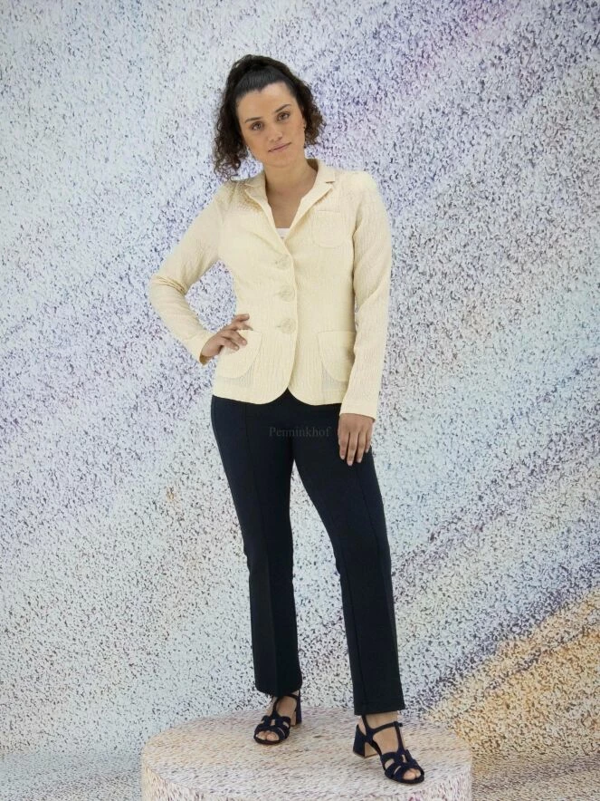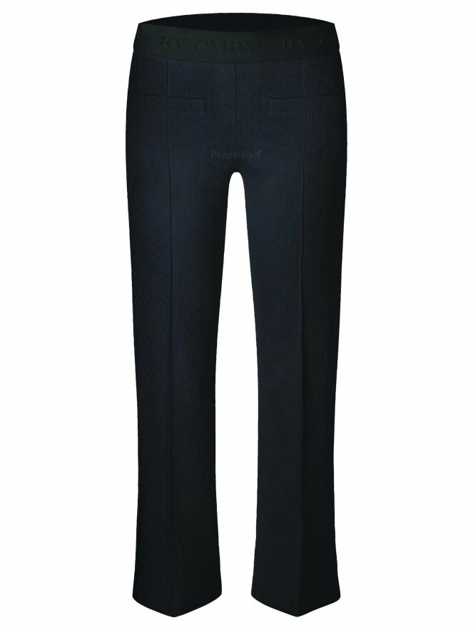 Pantalon évasé de la marque Cambio, dans une structure en relief de couleur bleu marine. La taille est équipée d’une bande élastique blanche. Lavage à la main.