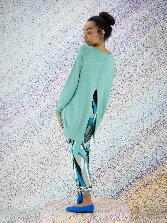 Pantalon de la marque Cambio, à imprimé pop art aux multiples nuances de turquoise avec du blanc crème et du noir. Une bande élastique noire équipe la taille. Un plis de rassage habille le milieu de la jambe. Lavage à 30 degrés.