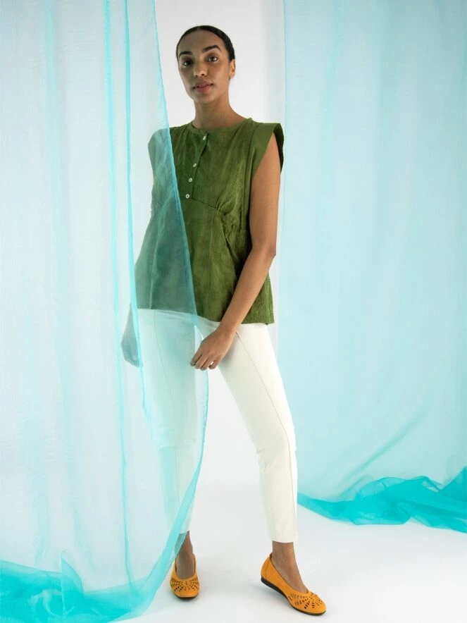 Un pantalon de Cambio en blanc crème. La taille est équipée d’une bande élastique. Une couture court sur le milieu des jambes. Ce pantalon peut être lavé à la main.