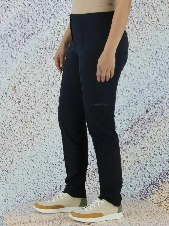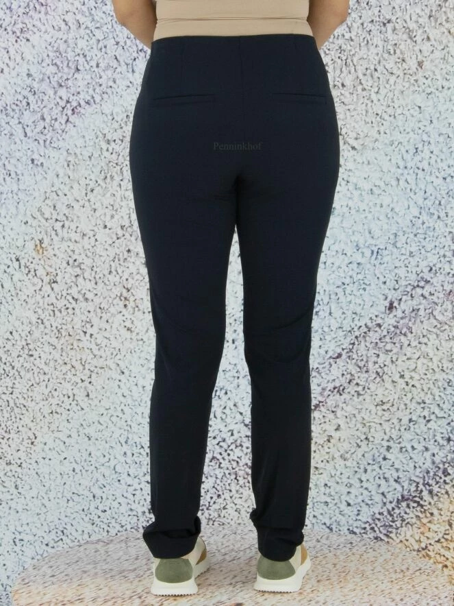 Pantalon de la marque Cambio, de couleur bleu marine. Un pli de repassage surpiqué orne la jambe. Une bande élastique équipe la taille. Lavage à la main.