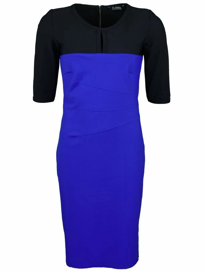 Robe près du corps, de la marque d’Etoiles Casiopé, de couleur noir et bleu cobalt. A hauteur de la taille, trois coutures courbes plissées partent d’un côté vers l’autre Modèle à col rond et manches demi. Lavage à 30 degrés.