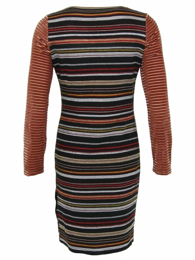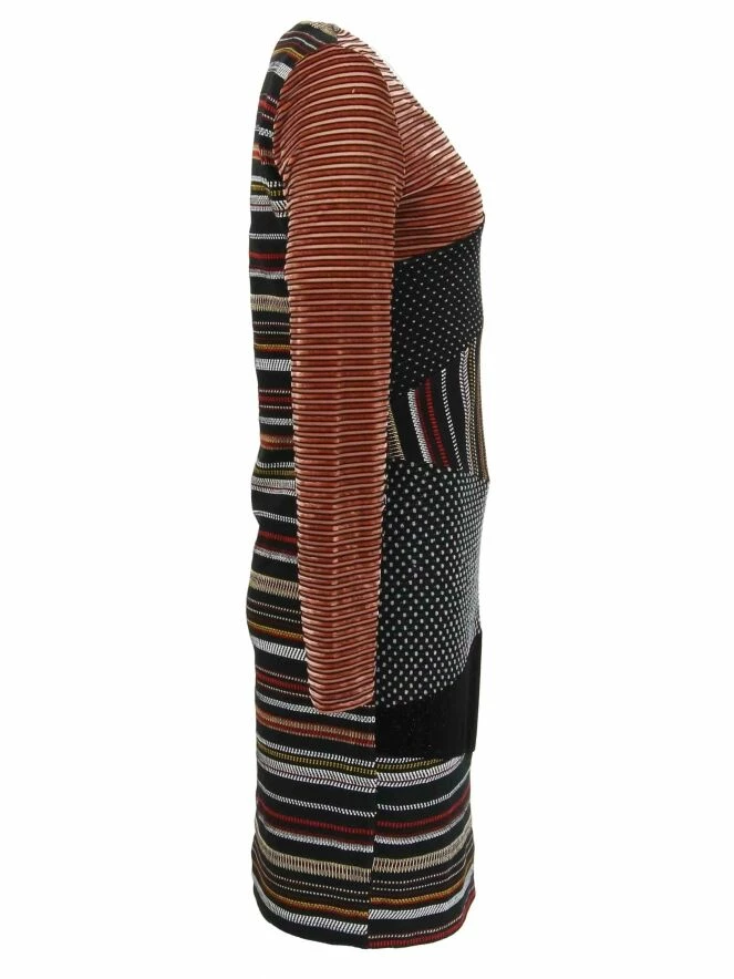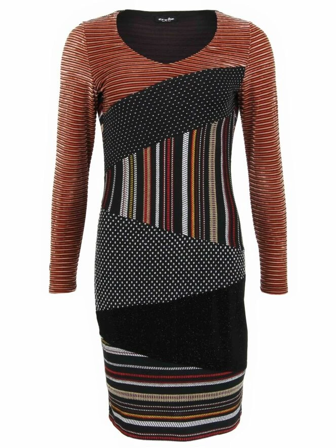Robe de la marque Eroke, imprimée de motifs fait de lignes horizontales et verticales et de petits points, allant du brun au blanc et contenus dans des formes triangulaires diagonales à l’avant, et horizontales à l’arrière. Modèle doublé. Lavage à 30 degrés.