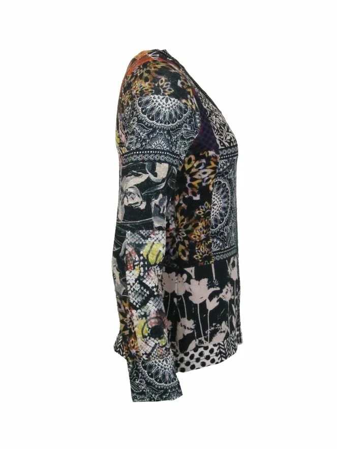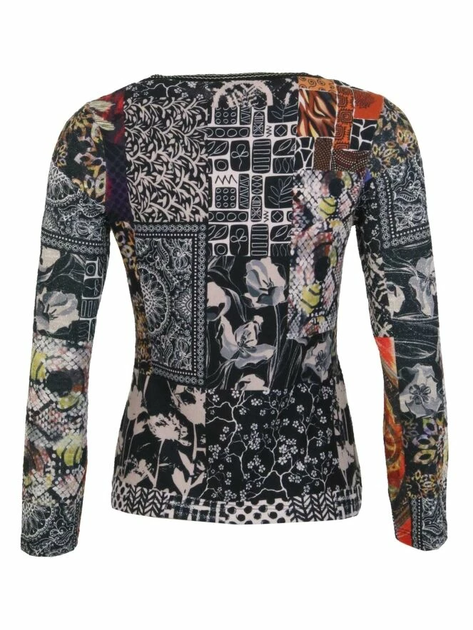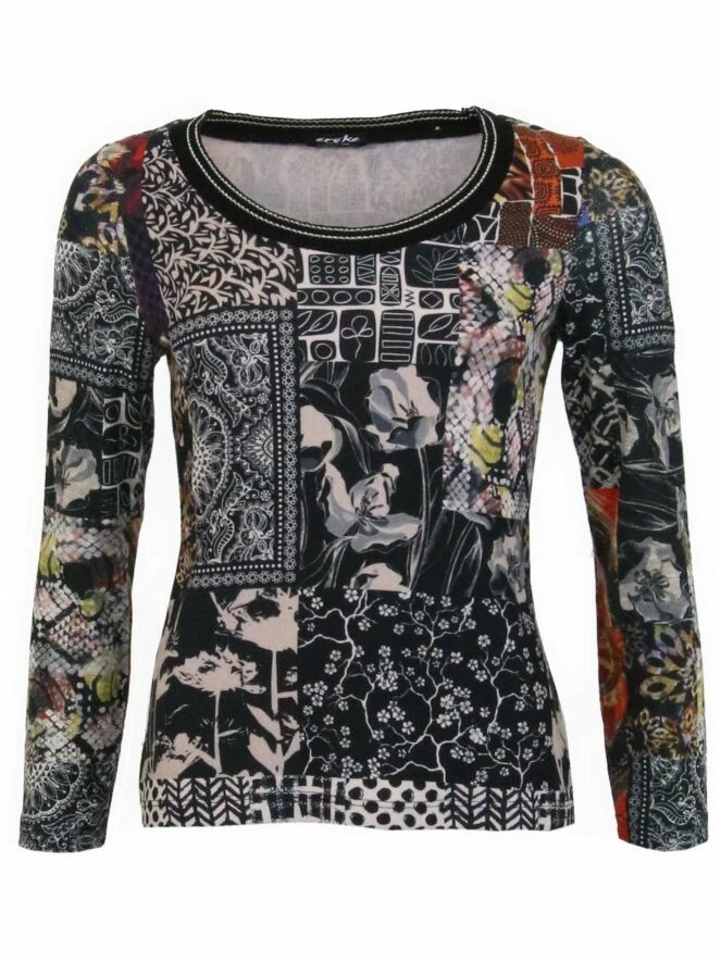 Tee-shirt à manches longues de la marque Eroke, imprimé d’un motif graphique avec du beige et du noir comme couleurs principales. Une bordure en jersey à rayures noir et blanc orne le col rond. Lavage à la main.