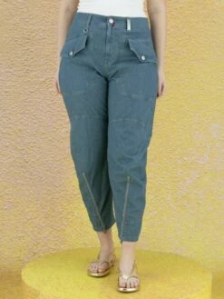 Jeans de la marque High, de couleur rose délavé tirant sur du blanc crème. Une couture en forme de S enroule la jambe depuis la poche arrière jusqu’au au bas de l’avant. Modèle à cinq poches. Lavage à 30 degrés.