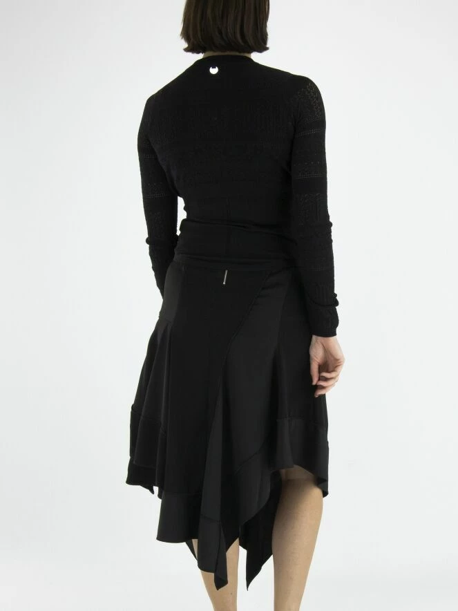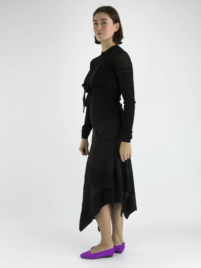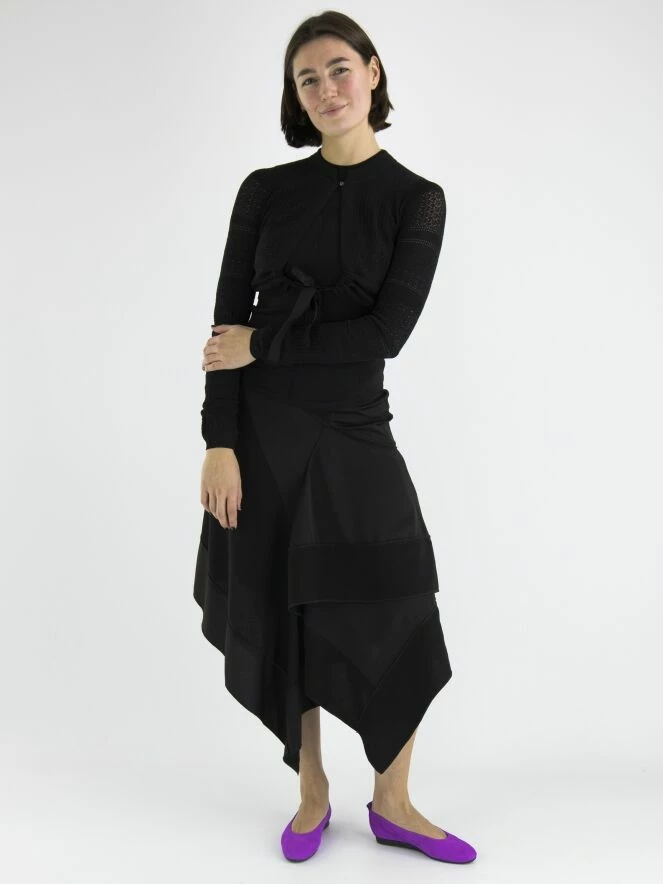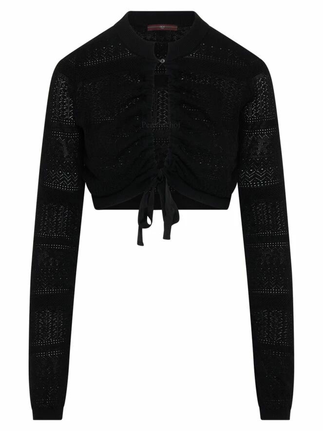 Un boléro de High en noir. Le tissu élastique est finement perforé dans une structure baroque. Le long du bord du col rond et en bas, il y a un bord en tricot finement côtelé. Il y a une fermeture à bouton sous le col. Au centre du bas, il y a deux rubans en satin mat avec lesquels le boléro peut être fermé. Ce boléro peut être lavé à la main.