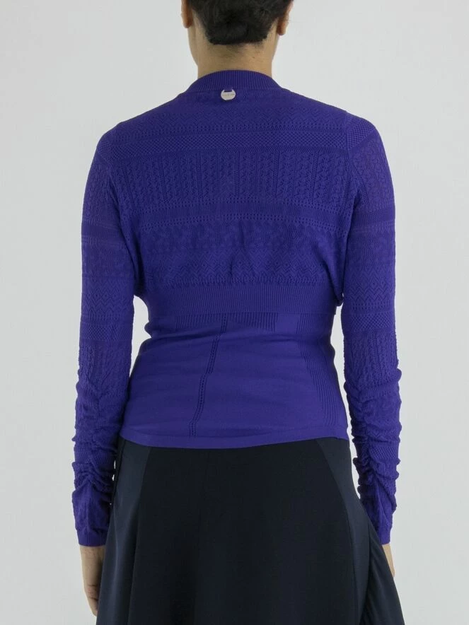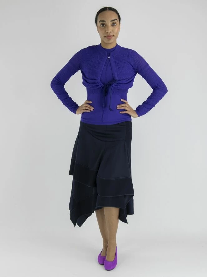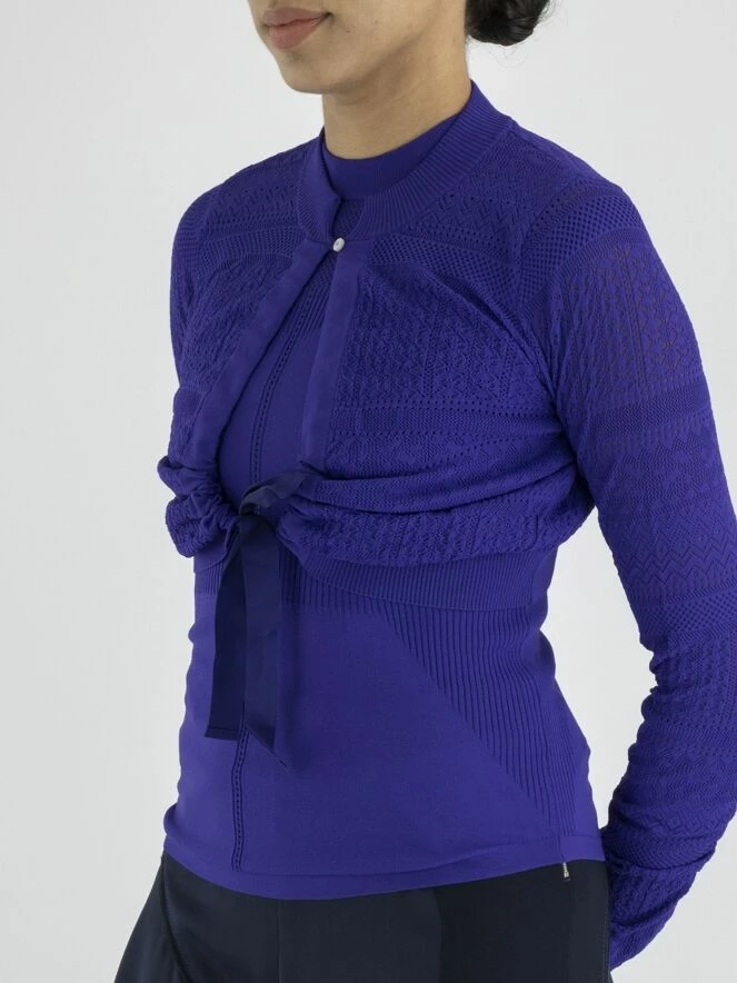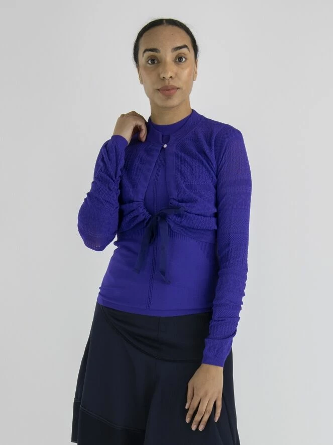 Un boléro de High en bleu cobalt. Le tissu élastique est finement perforé dans une structure baroque. Le long du bord du col rond et en bas, il y a un bord en tricot finement côtelé. Il y a une fermeture à bouton sous le col. Au centre du bas, il y a deux rubans en satin mat avec lesquels le boléro peut être fermé. Ce boléro peut être lavé à la main.