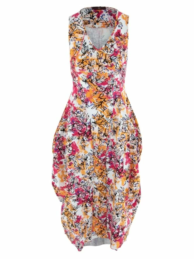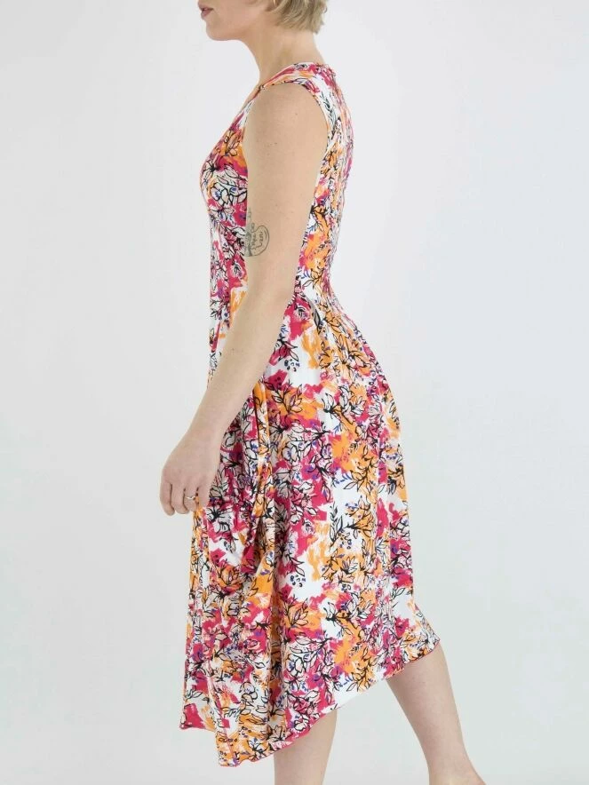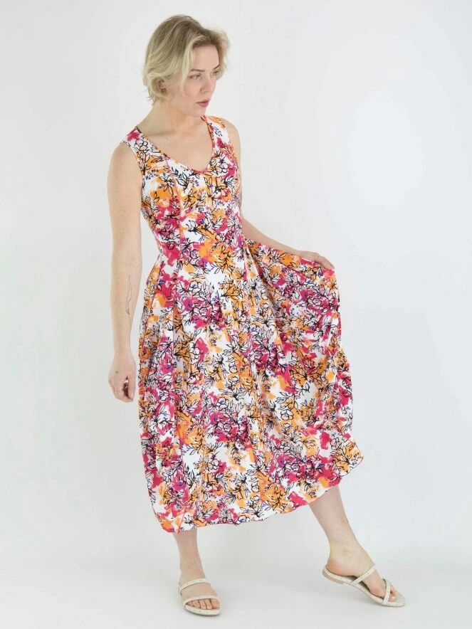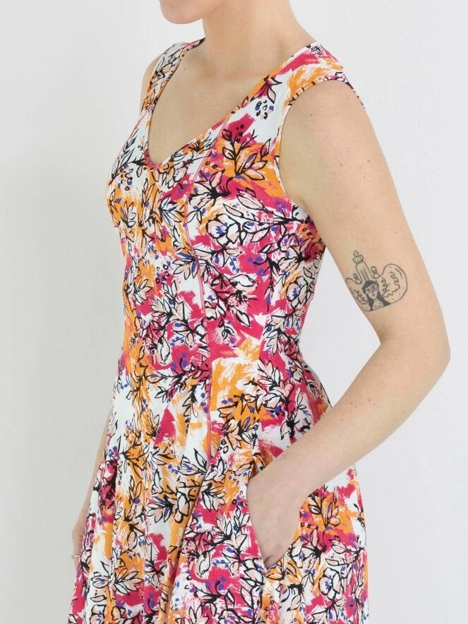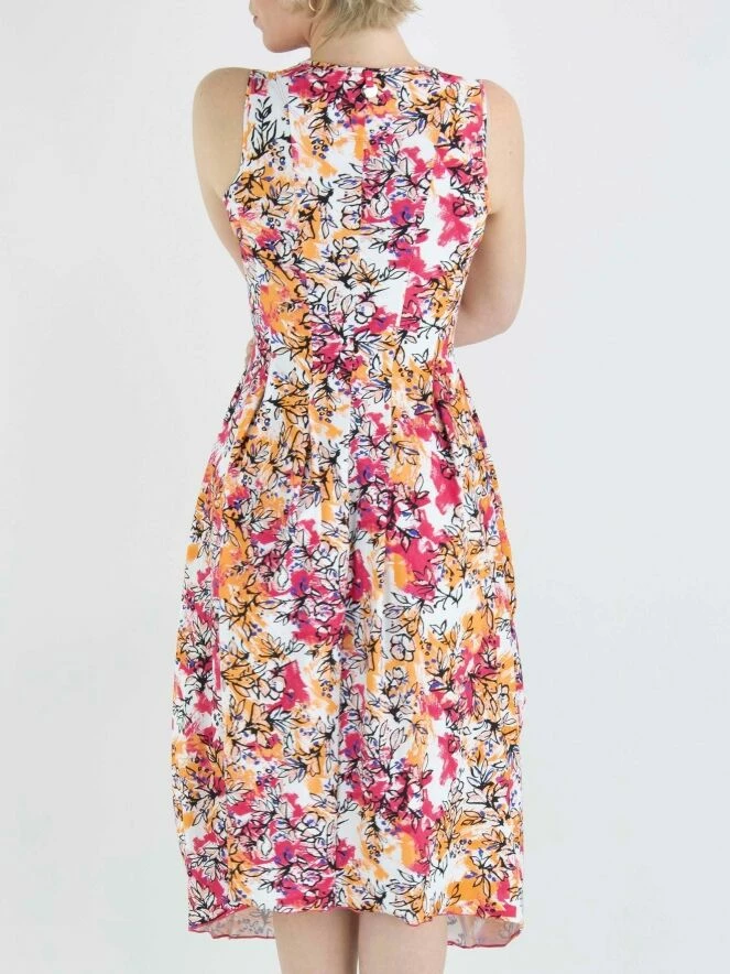 Une robe de High avec un imprimé floral graphique en orange, rouge, blanc et noir. Il y a des poches latérales à la hauteur de la taille. À partir de la taille, la robe a un effet ballon. La robe a un col en V et peut être lavée à 30 degrés.