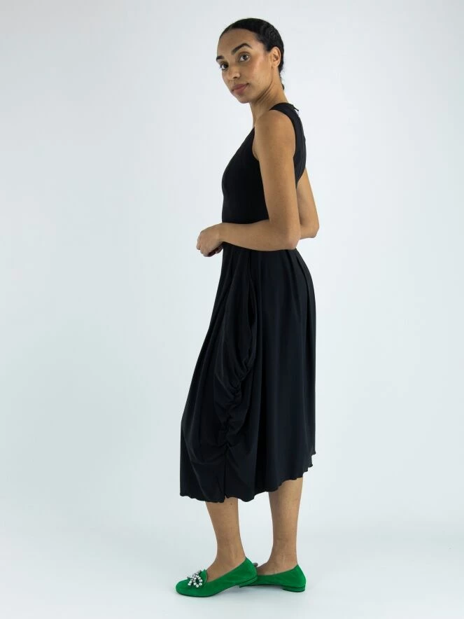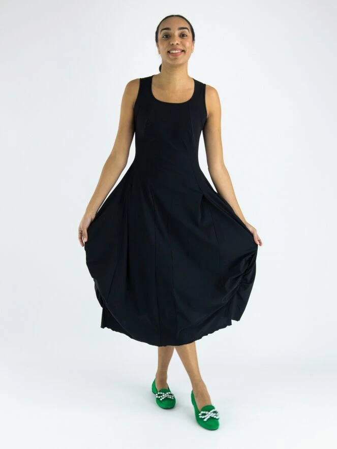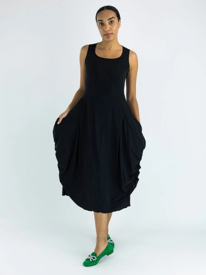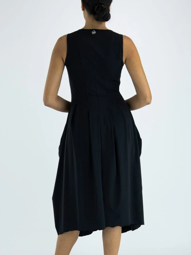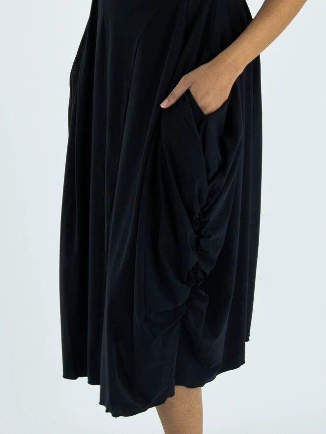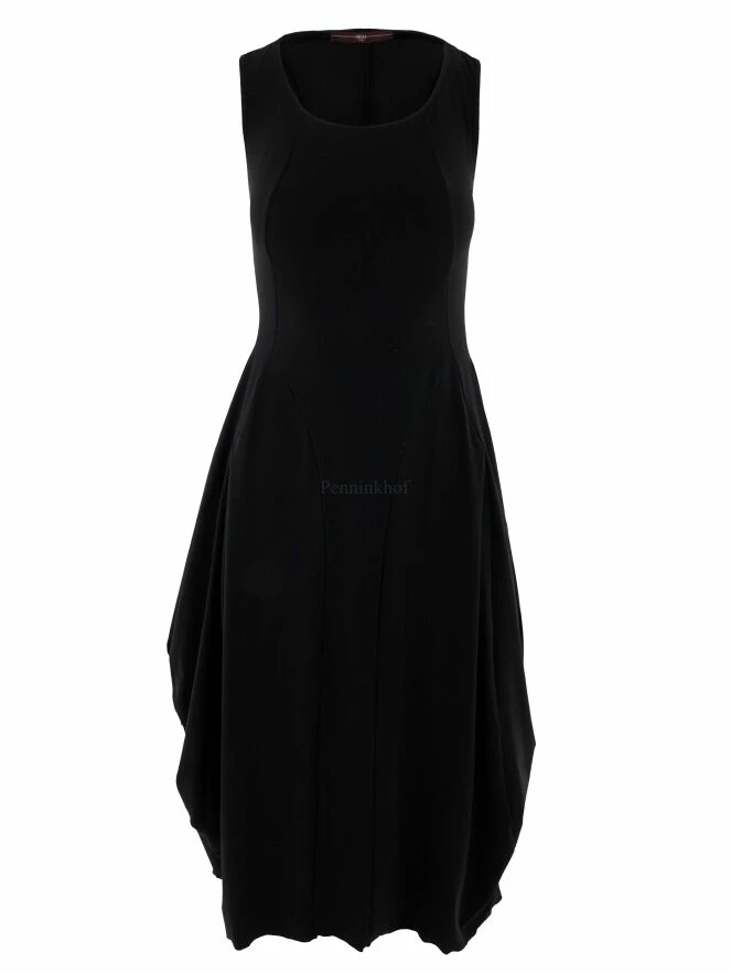 Une robe de High en noir. La robe a un col rond, et à partir de la taille, elle a un effet ballon. Il y a des poches latérales au niveau de la taille. Cette robe peut être lavée à 30 degrés.