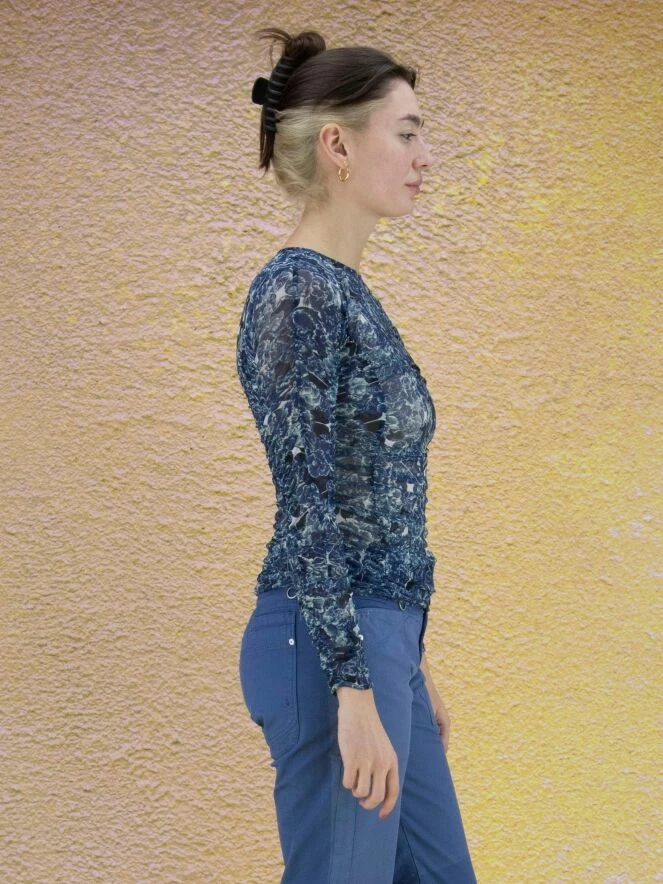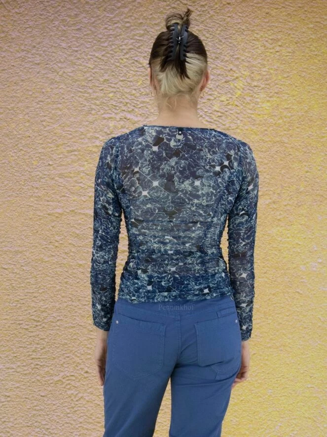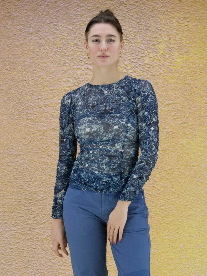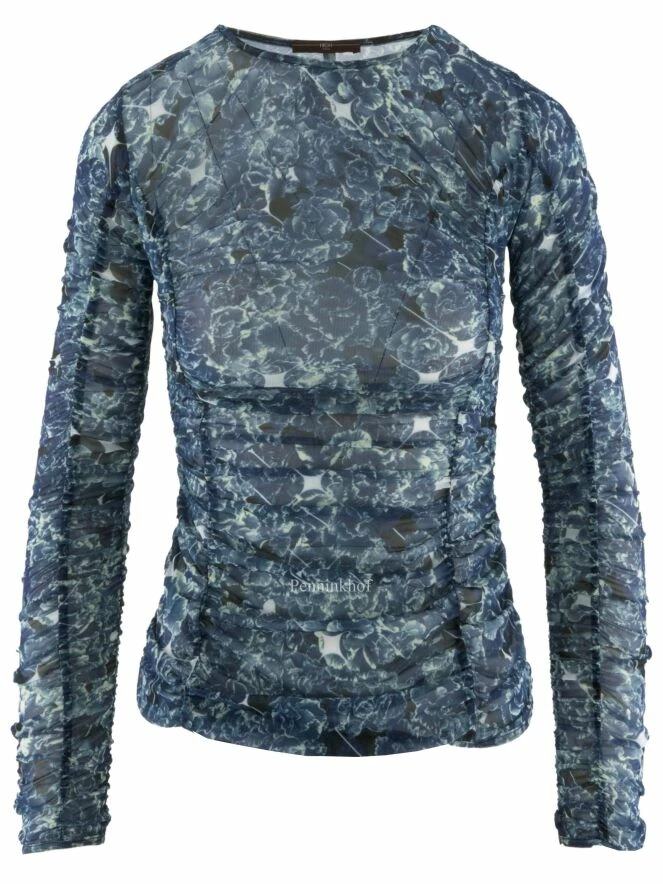 Top moulant et transparent de la marque High, à imprimé floral abstrait aux multiples nuances de bleu et de blanc. Le long des fronces, des coutures créent de multiples drapés sur le devant, le dos et les manches. Lavage à la main.