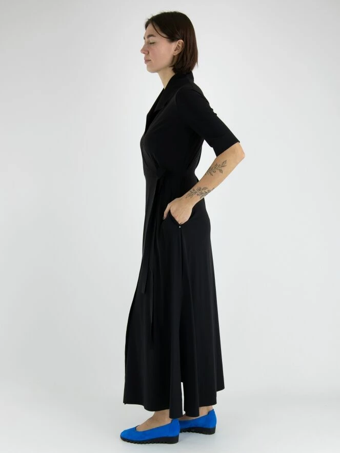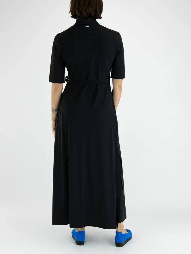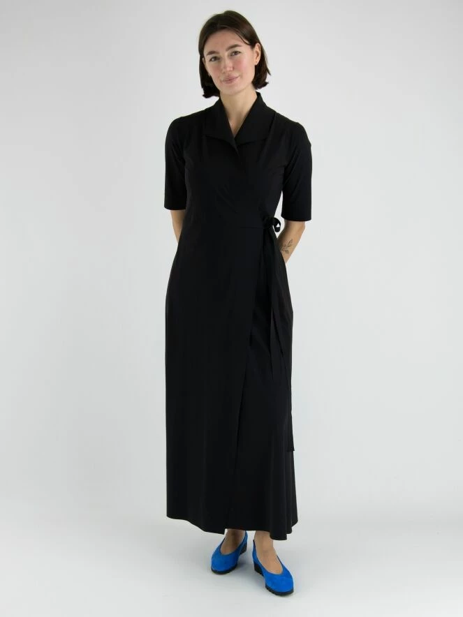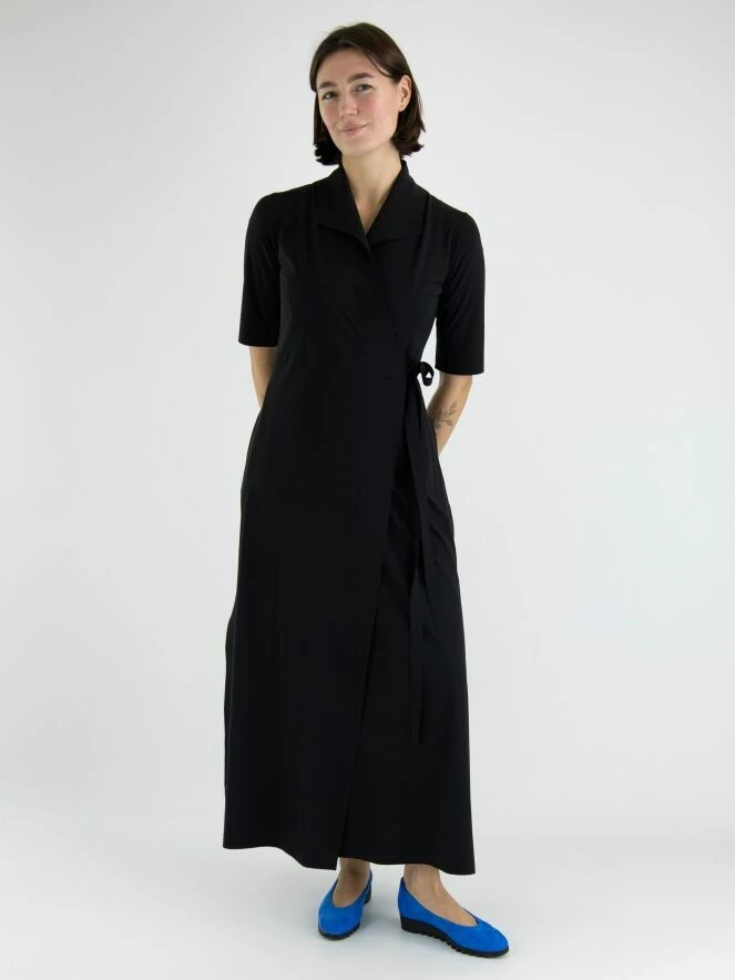 Une robe portefeuille de High en noir. La robe a des manches courtes et des rubans à partir de la taille avec lesquels la robe portefeuille peut être fermée. À partir des genoux, il y a des fentes en bas. Cette robe peut être lavée à la main.