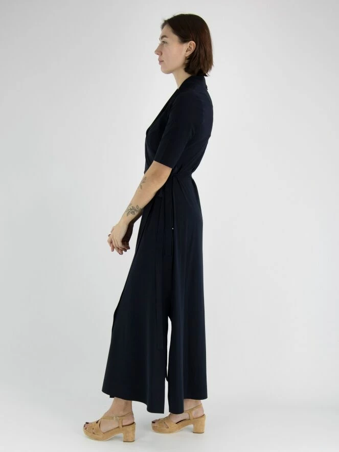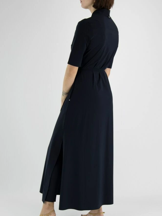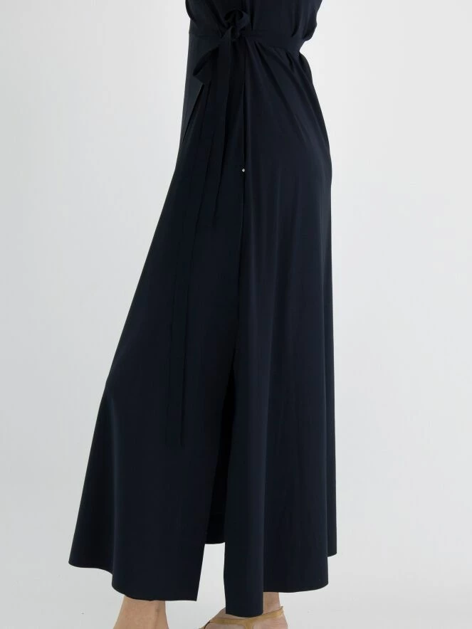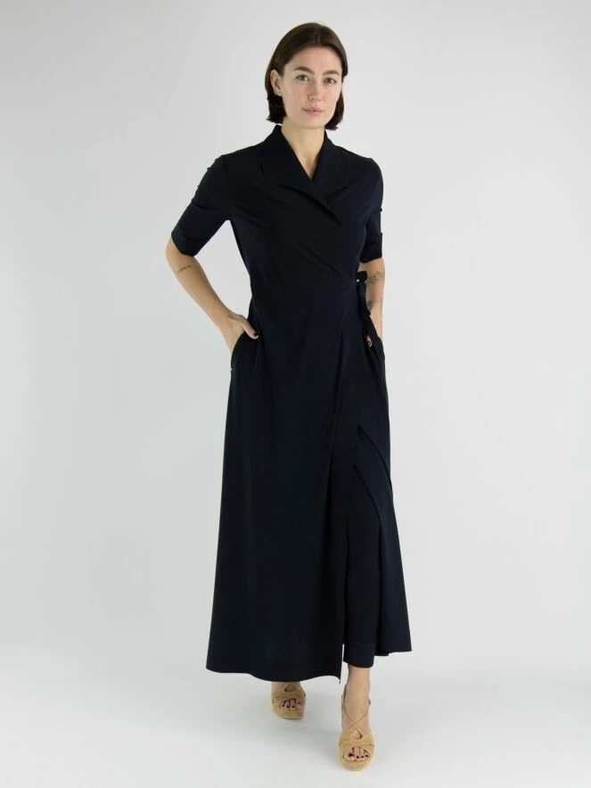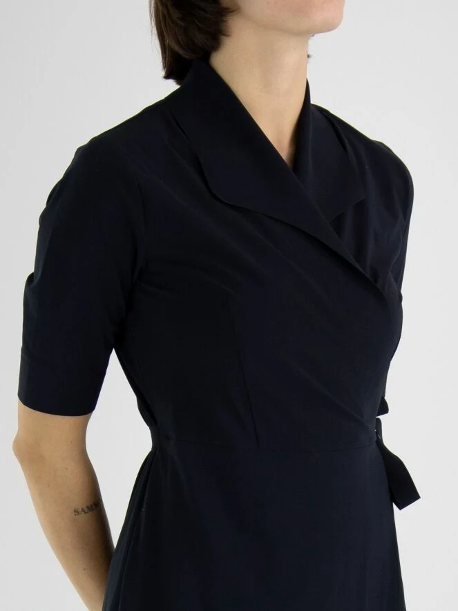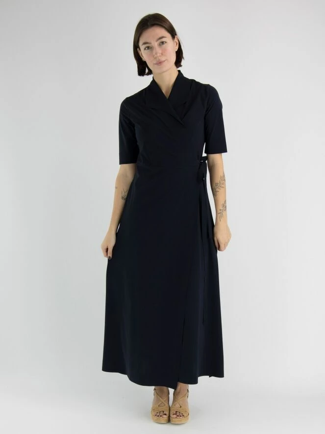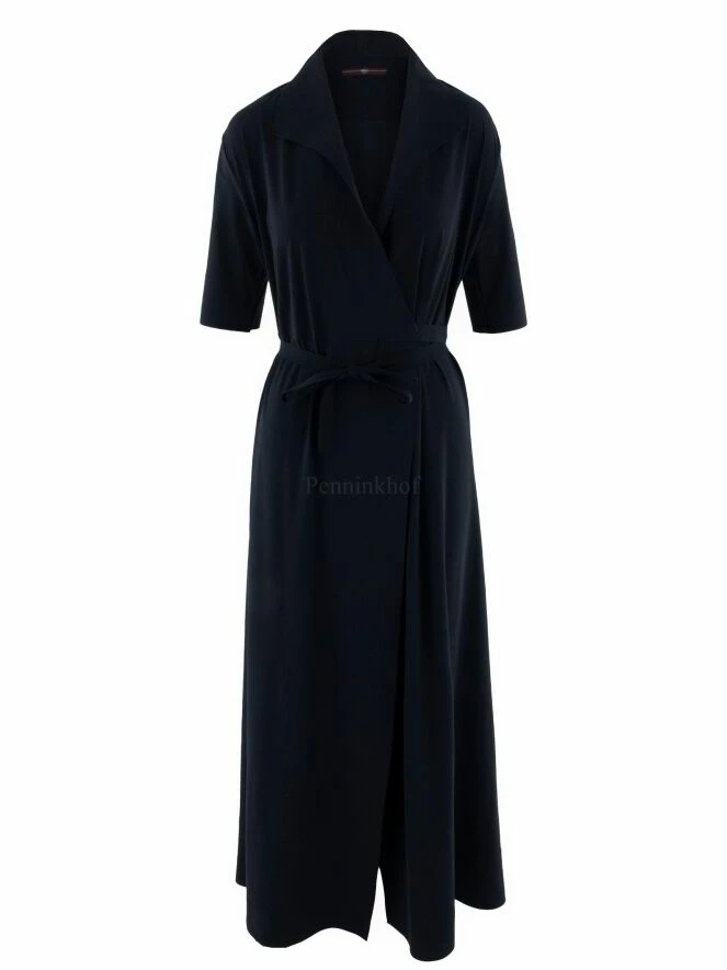 Une robe portefeuille de High en bleu marine. La robe a des manches courtes et des rubans à partir de la taille avec lesquels la robe portefeuille peut être fermée. À partir des genoux, il y a des fentes en bas. Cette robe peut être lavée à la main.