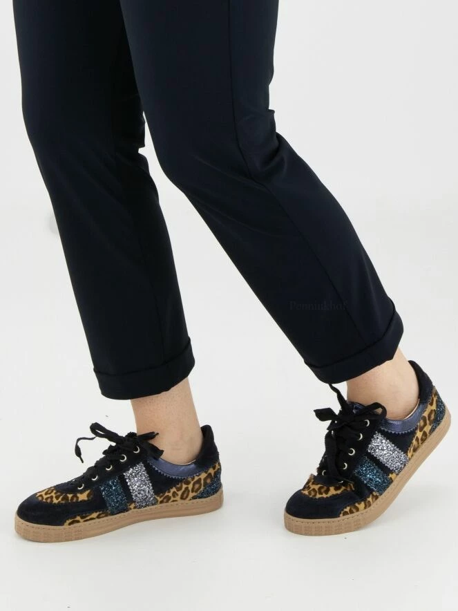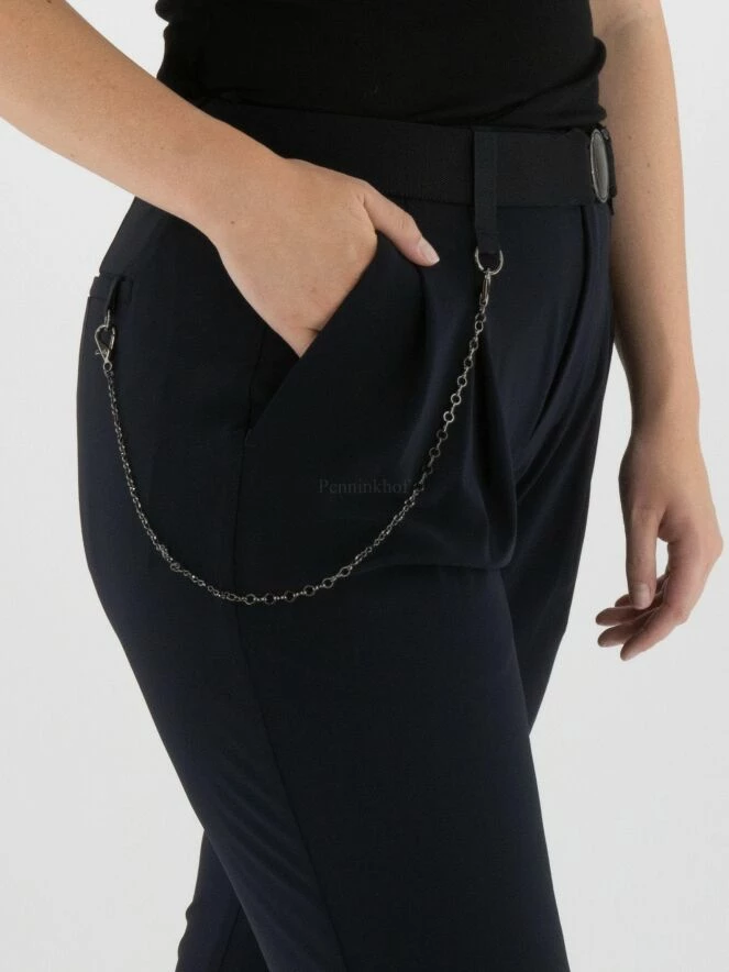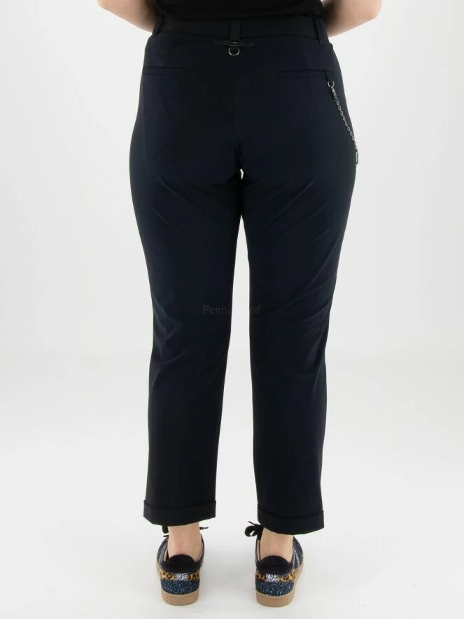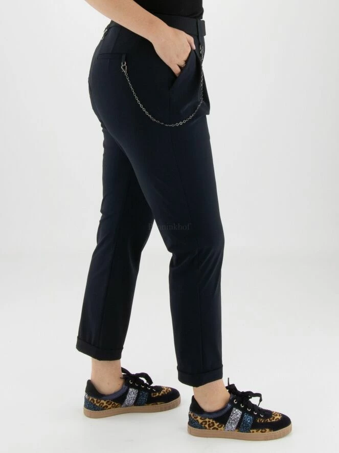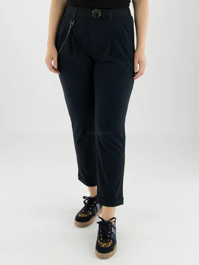 Pantalon de la marque High, de couleur bleu marine. La taille est équipée d’une ceinture élastiquée agrémentée d’une boucle ronde de couleur nickel. Des plis partent de la taille et le pantalon est doté de poches latérales. Un petit revers orne le bas des jambes. Lavage à 30 degrés.
