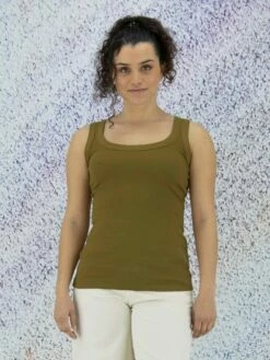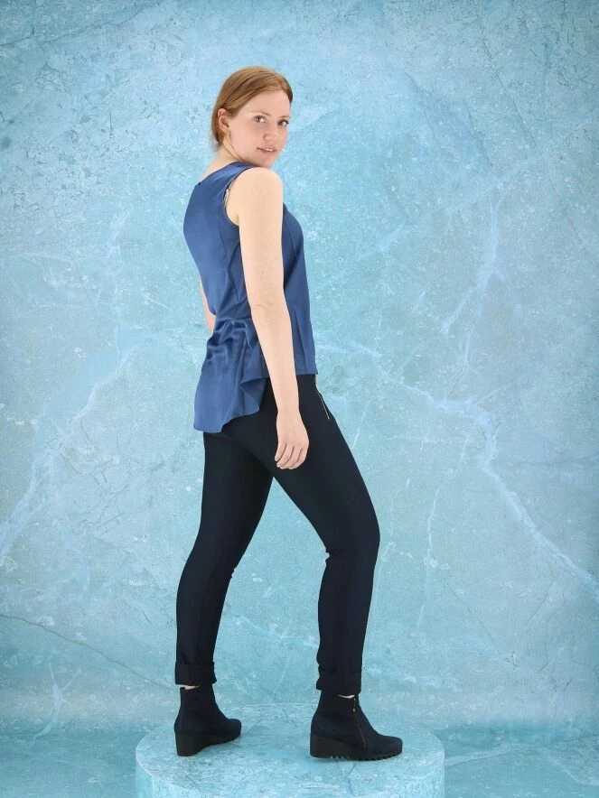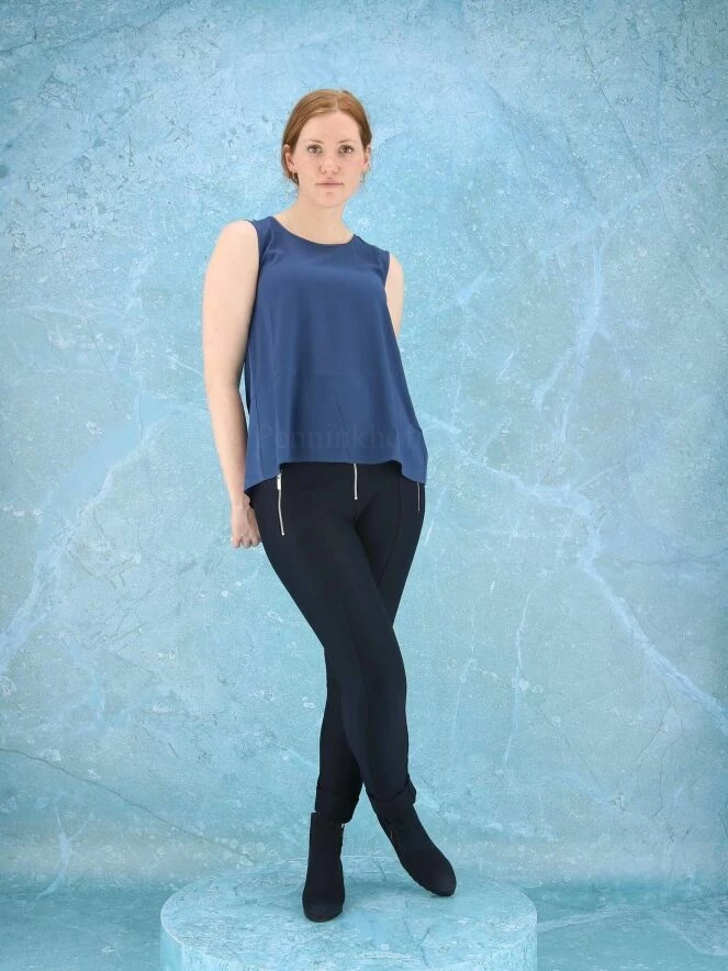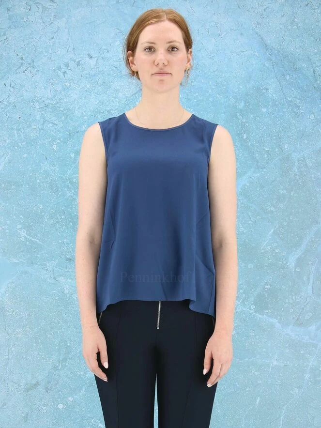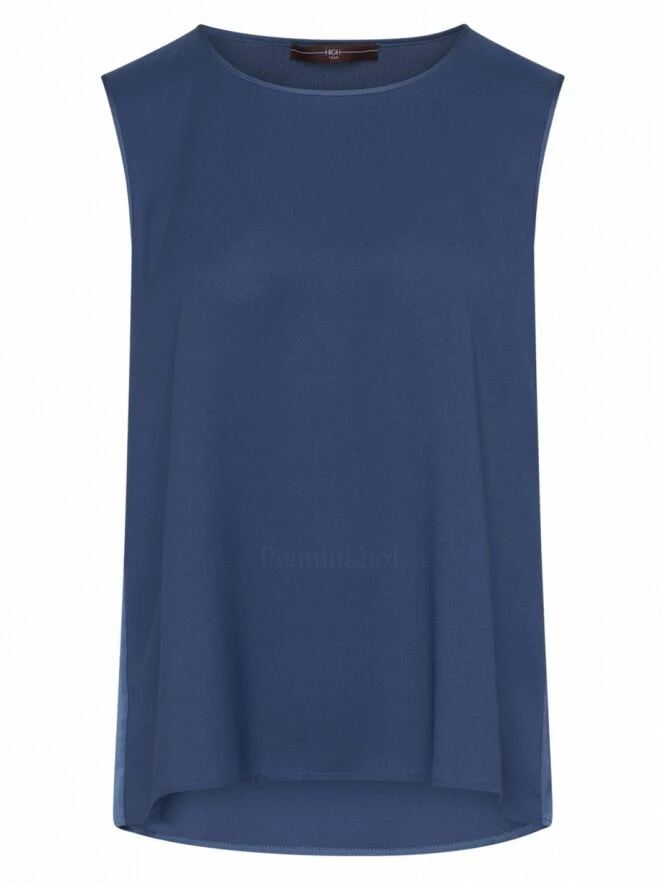 Top sans manches de la marque High, de couleur bleu nuit. Le top présente un col arrondi et une coupe légèrement en ligne A. Le col rond et les emmanchures sont bordés d’un liseré satiné. La base arrondie est plus longue dans le dos. Lavage à la main.